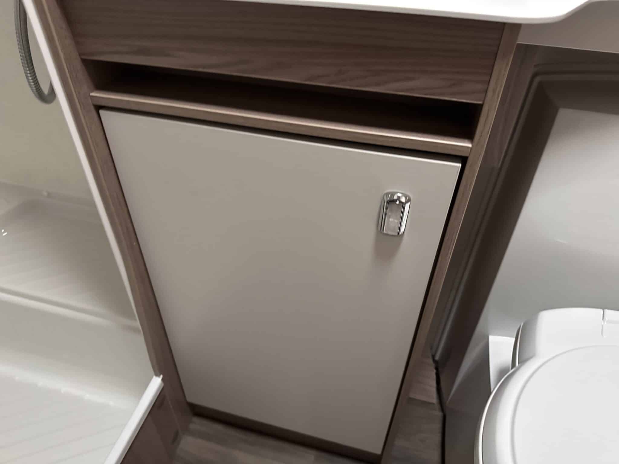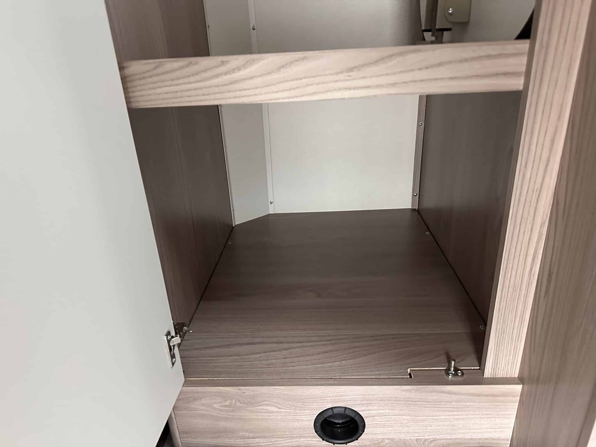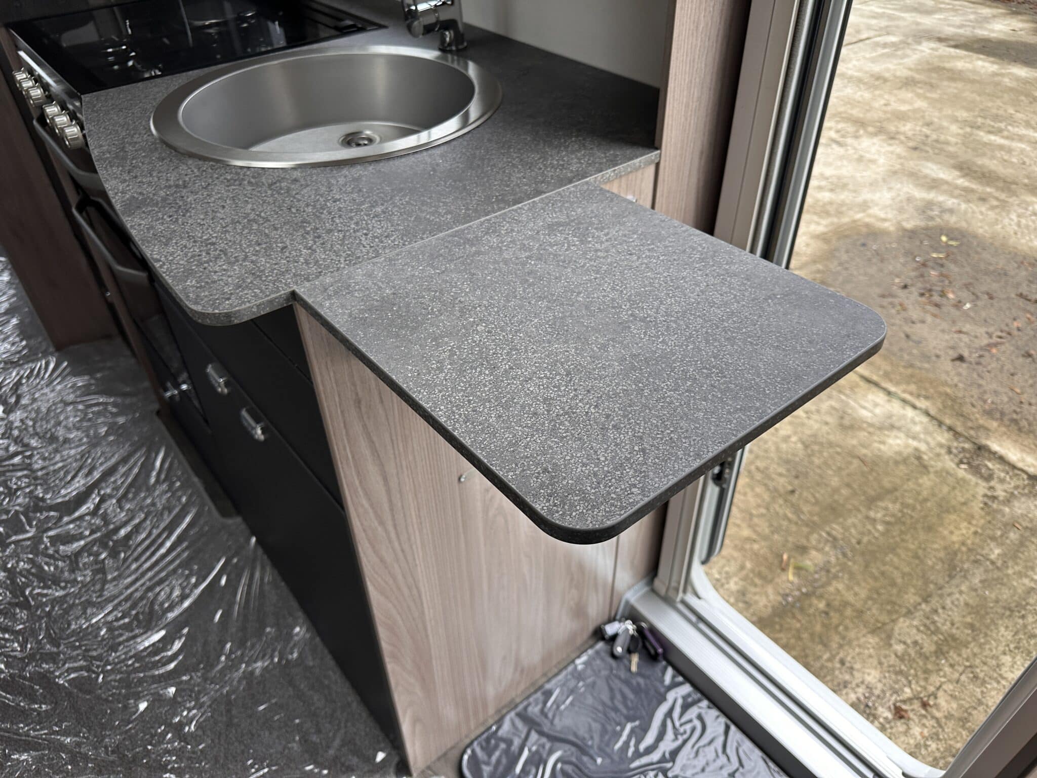 Kitchen with Thetford oven, grill, three-burner hob, and fridge