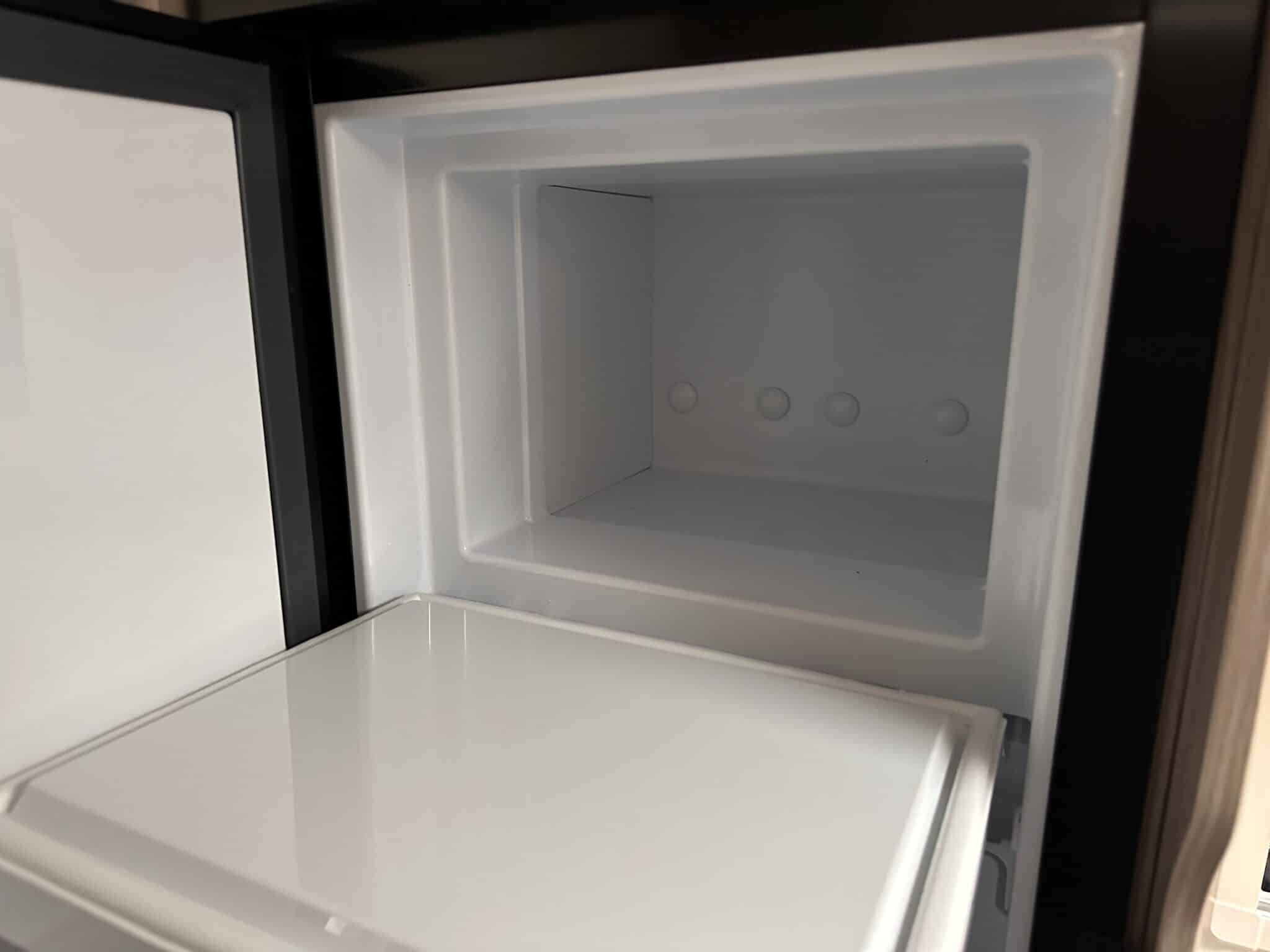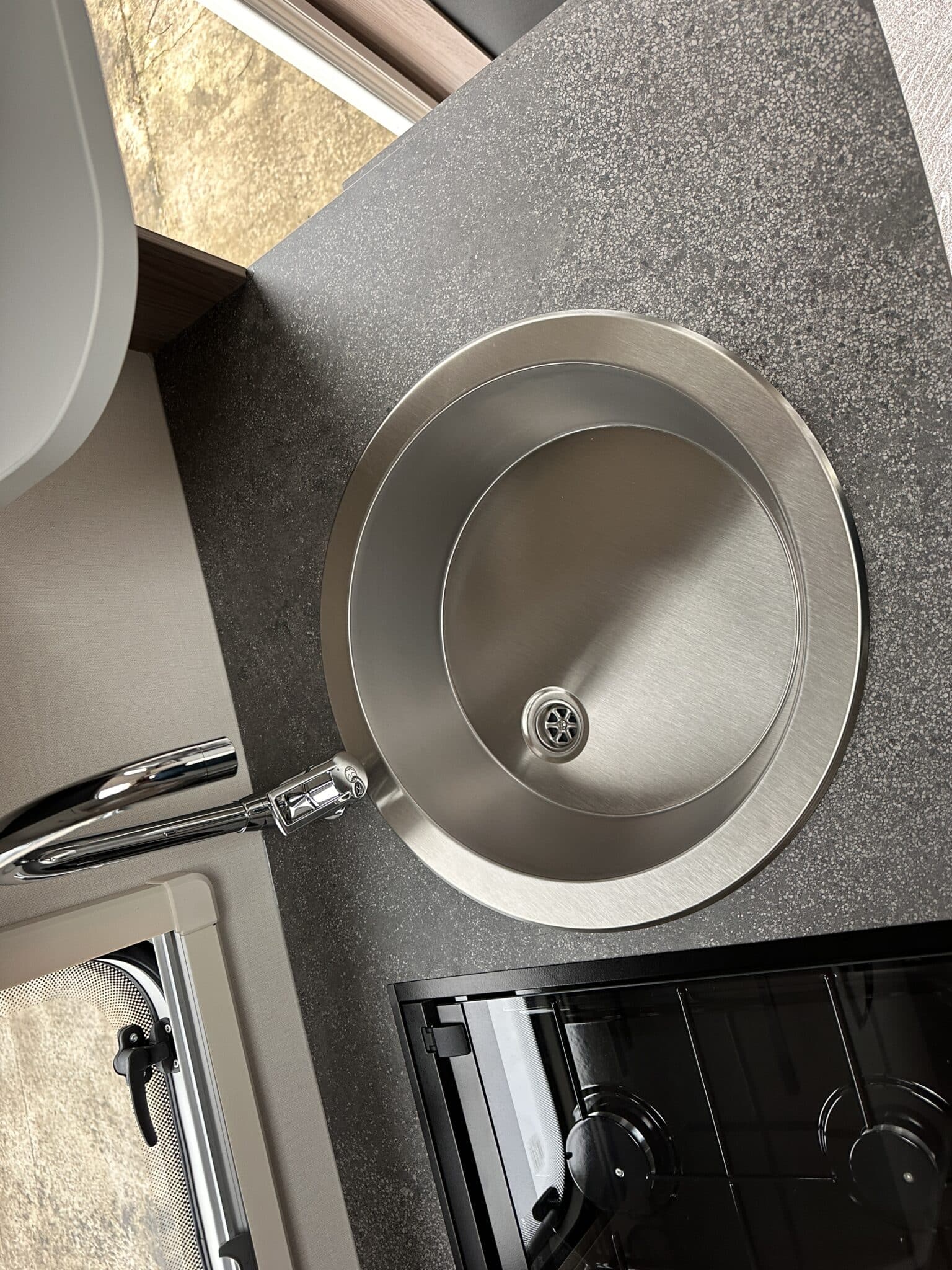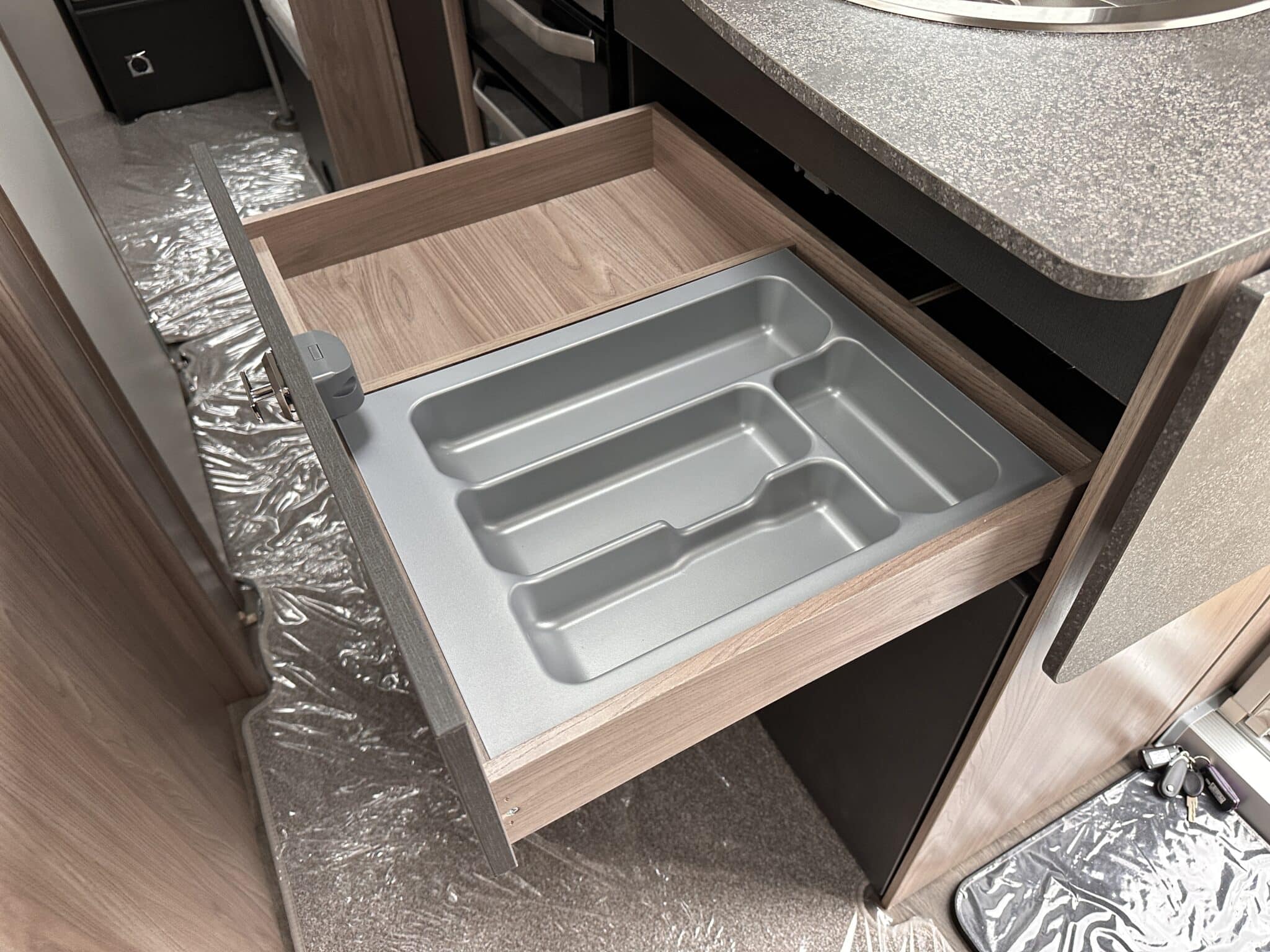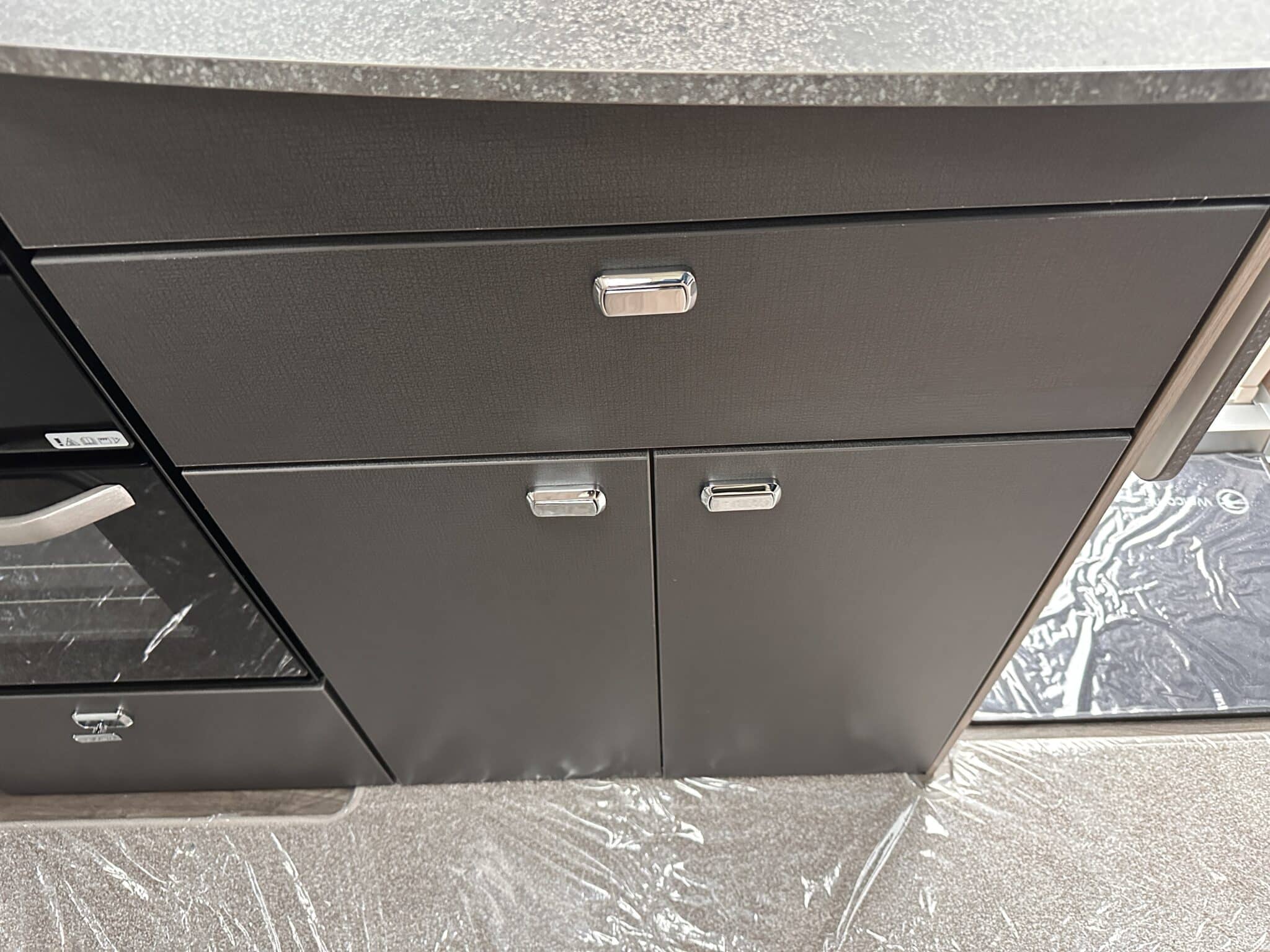 Kitchen with Thetford oven, grill, three-burner hob, and fridge