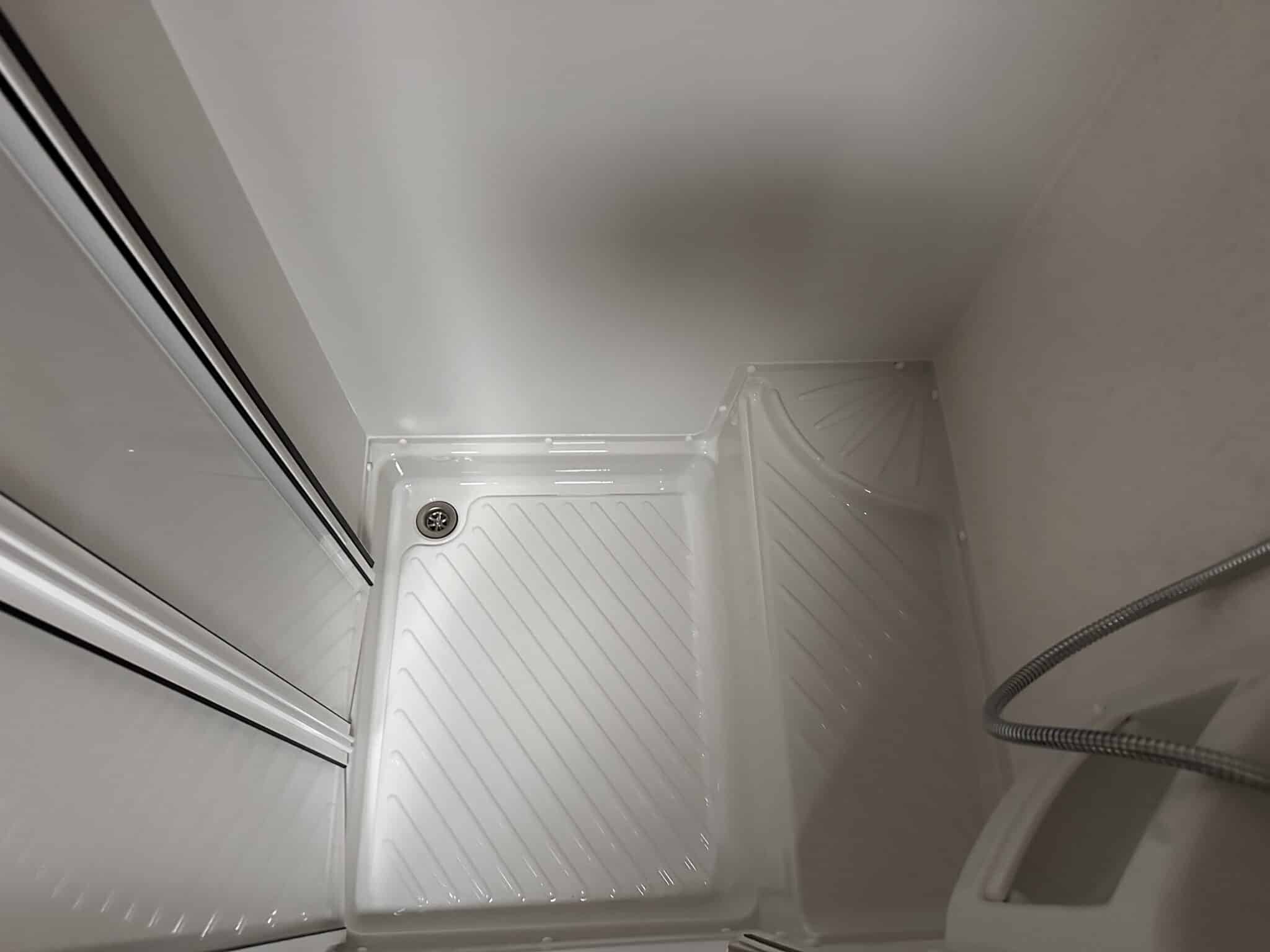 Family washroom with Ecocamel shower, basin, and cupboard