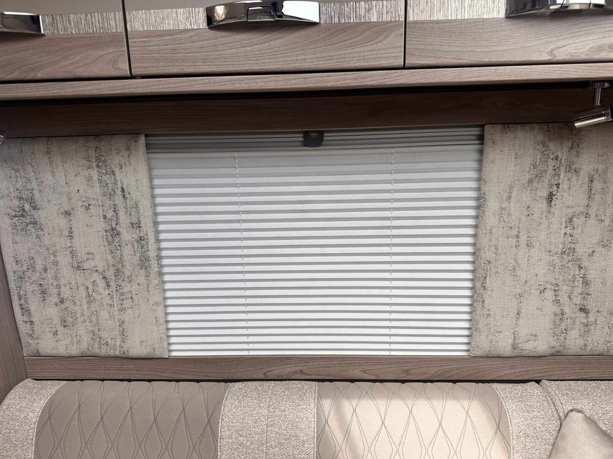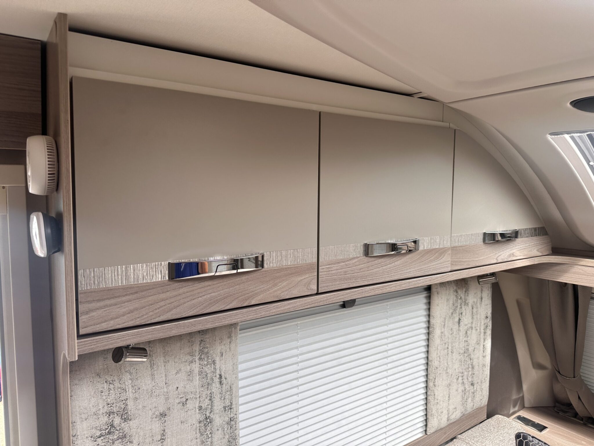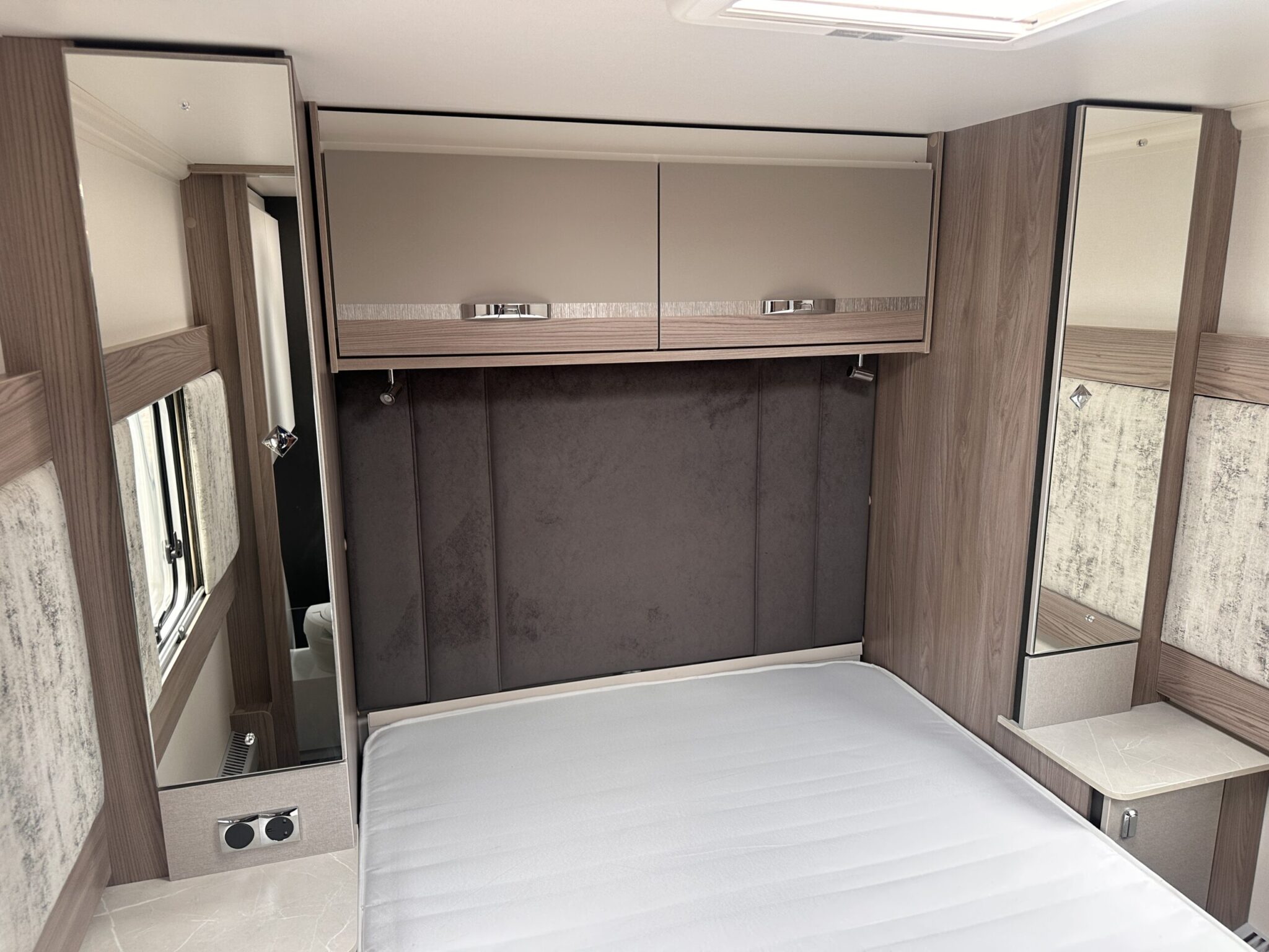 Fixed island bed at the rear with overhead lockers and bedside shelving