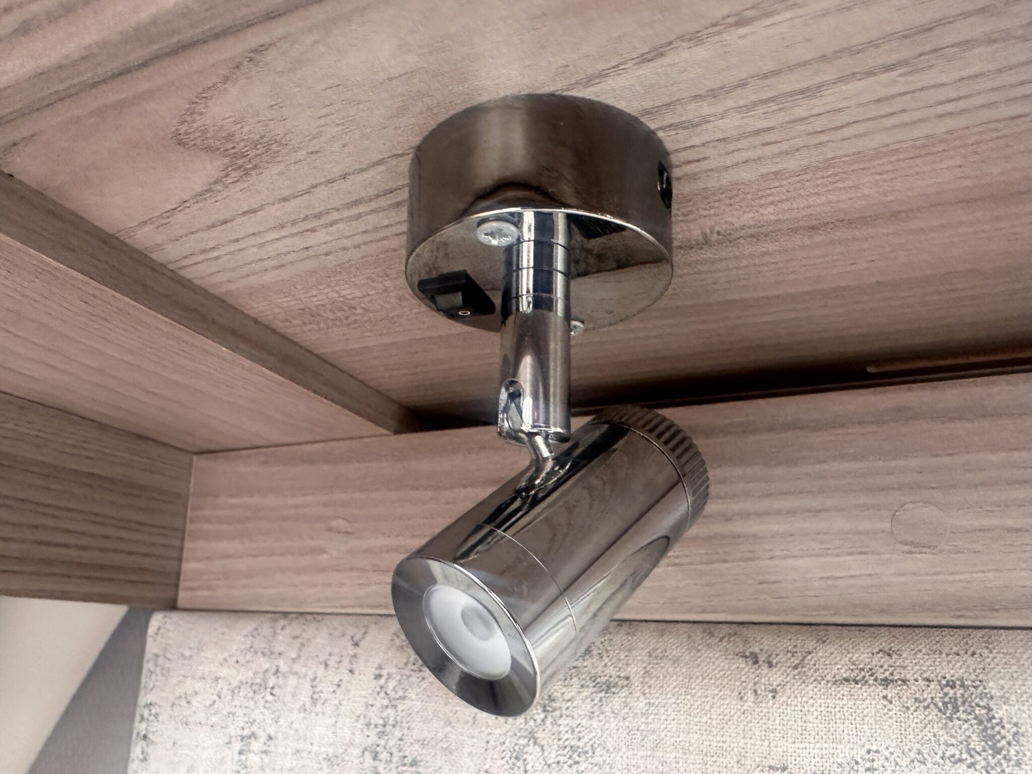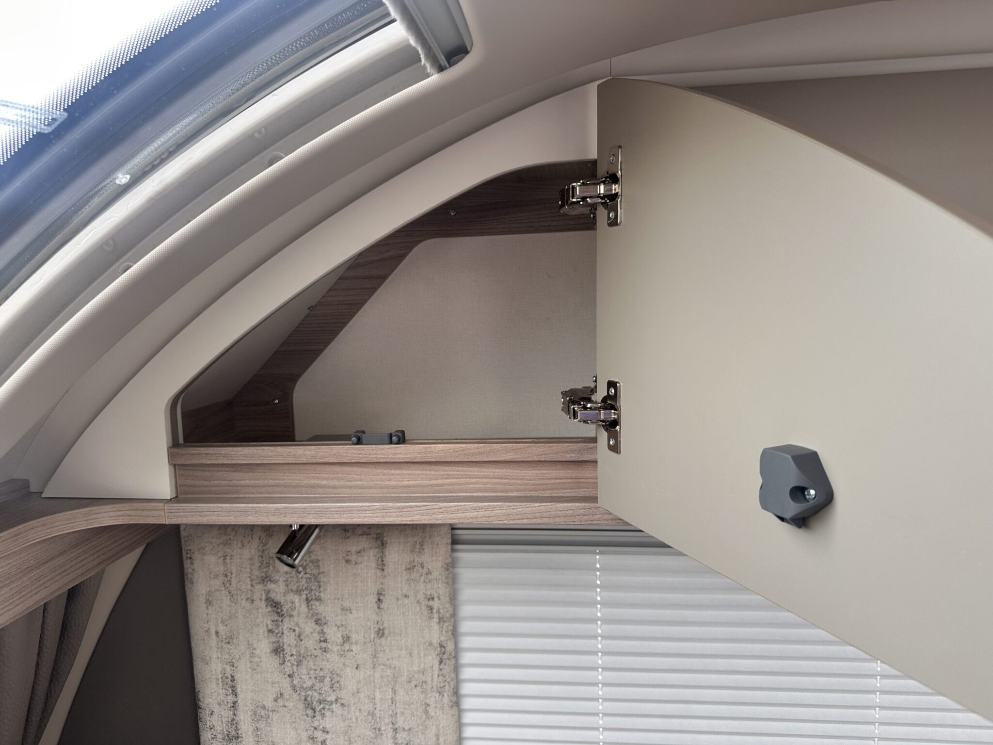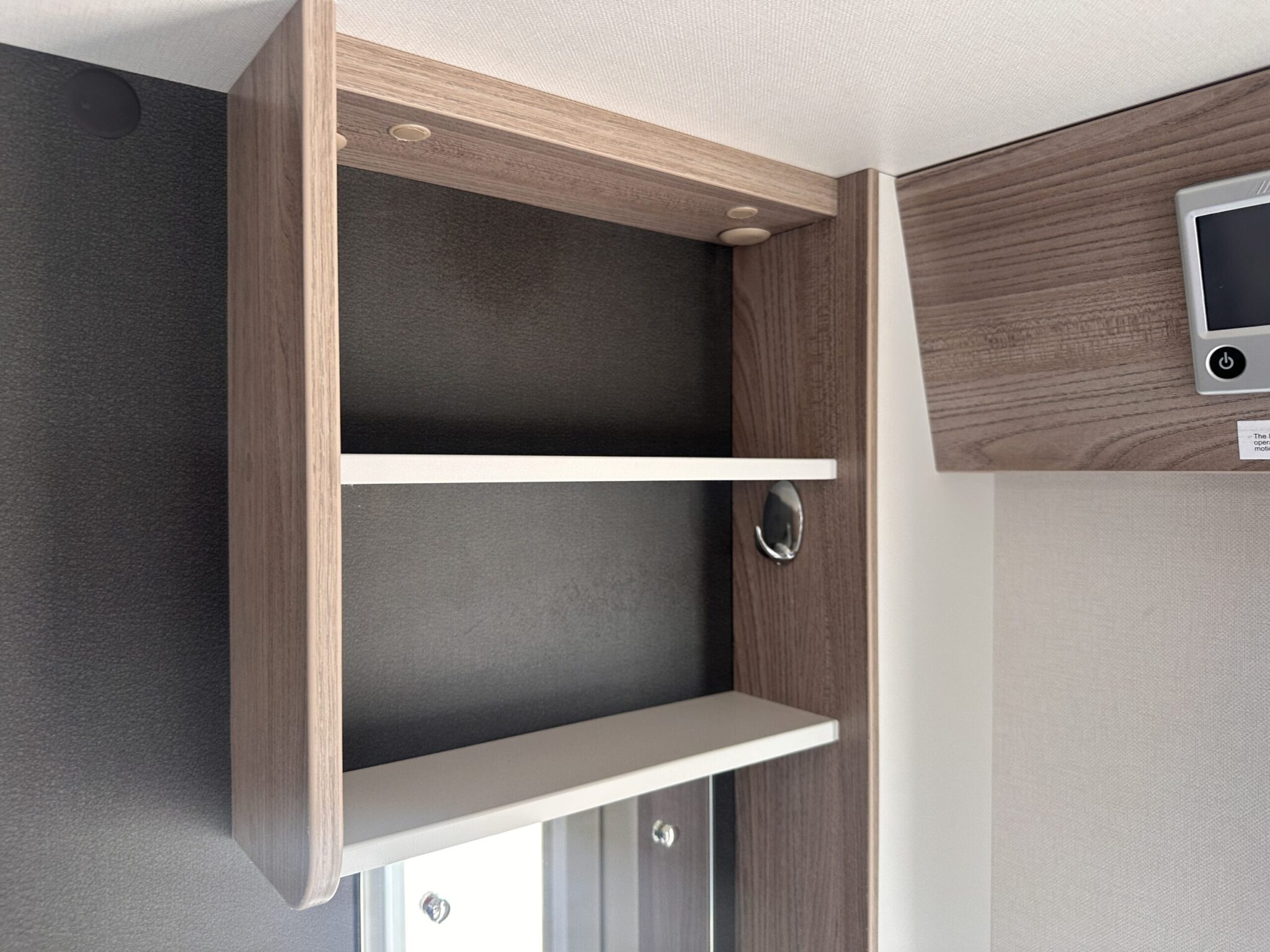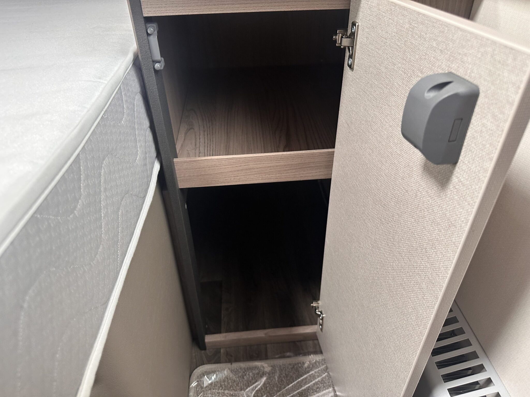 Fixed island bed at the rear with overhead lockers and bedside shelving
