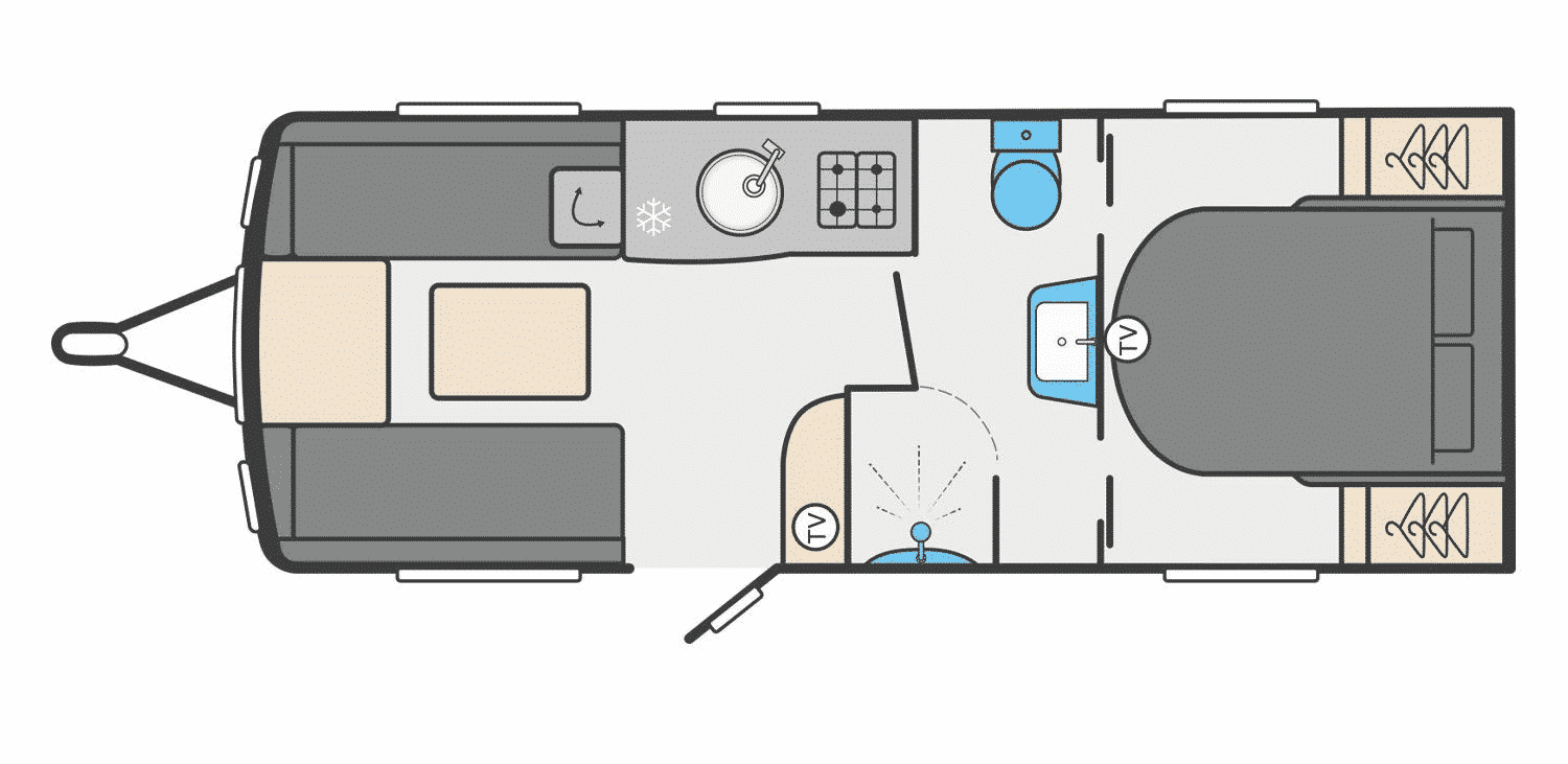 Layout: Fixed island bed, central washroom, front lounge