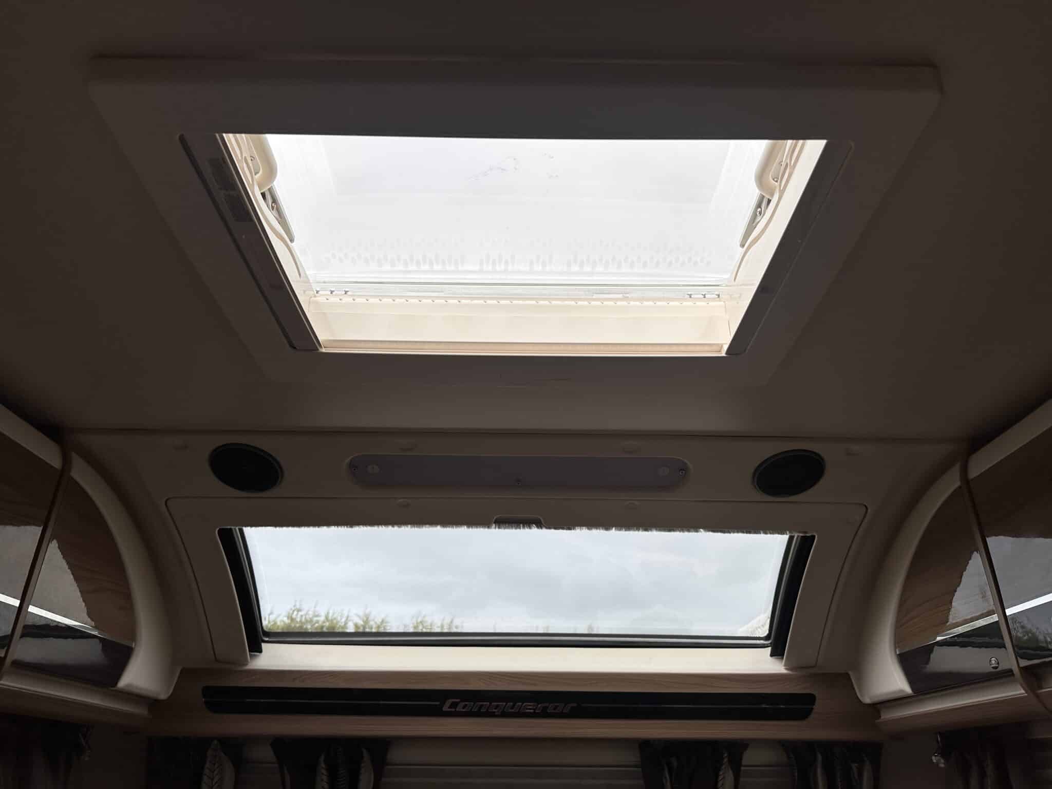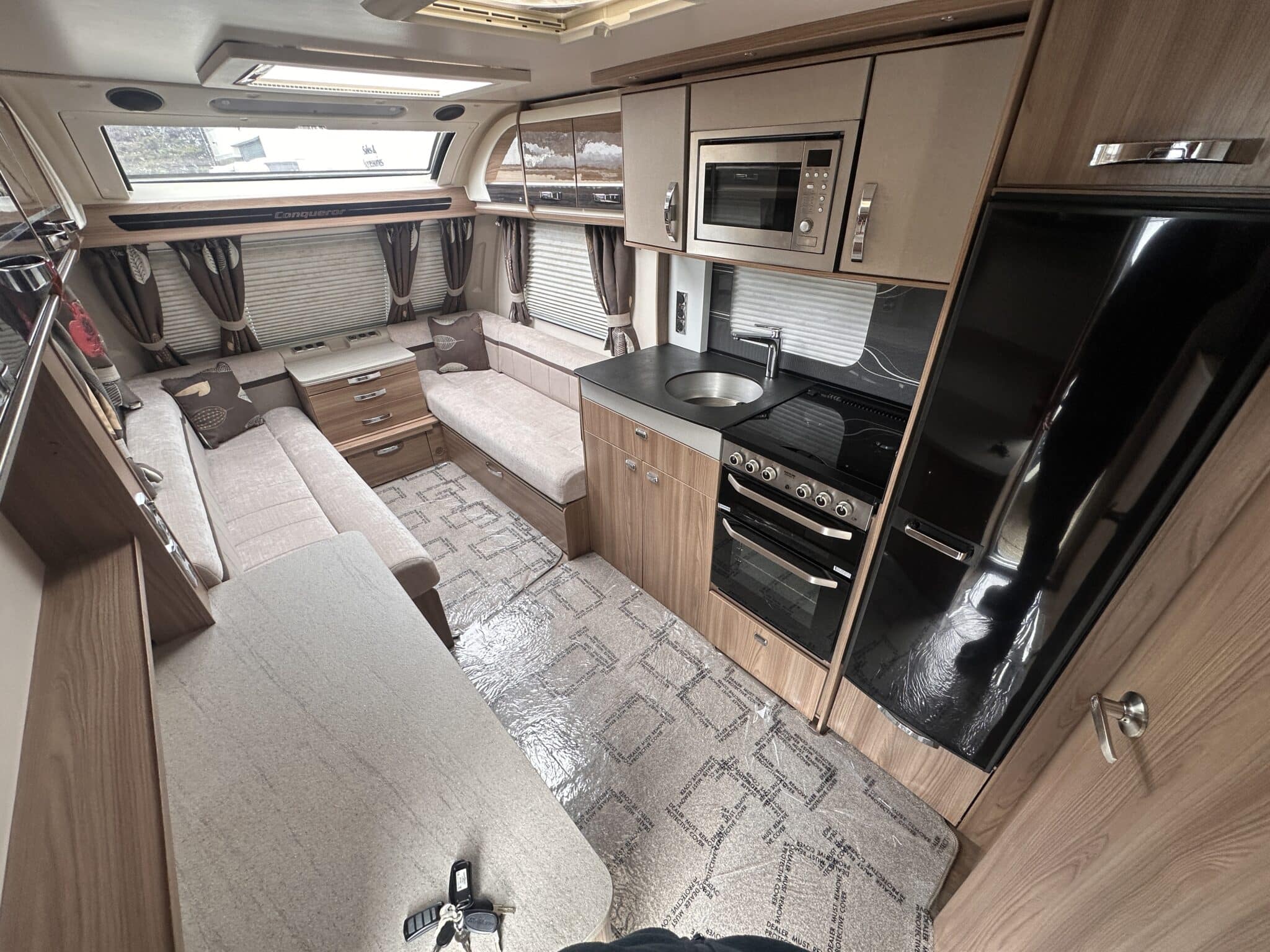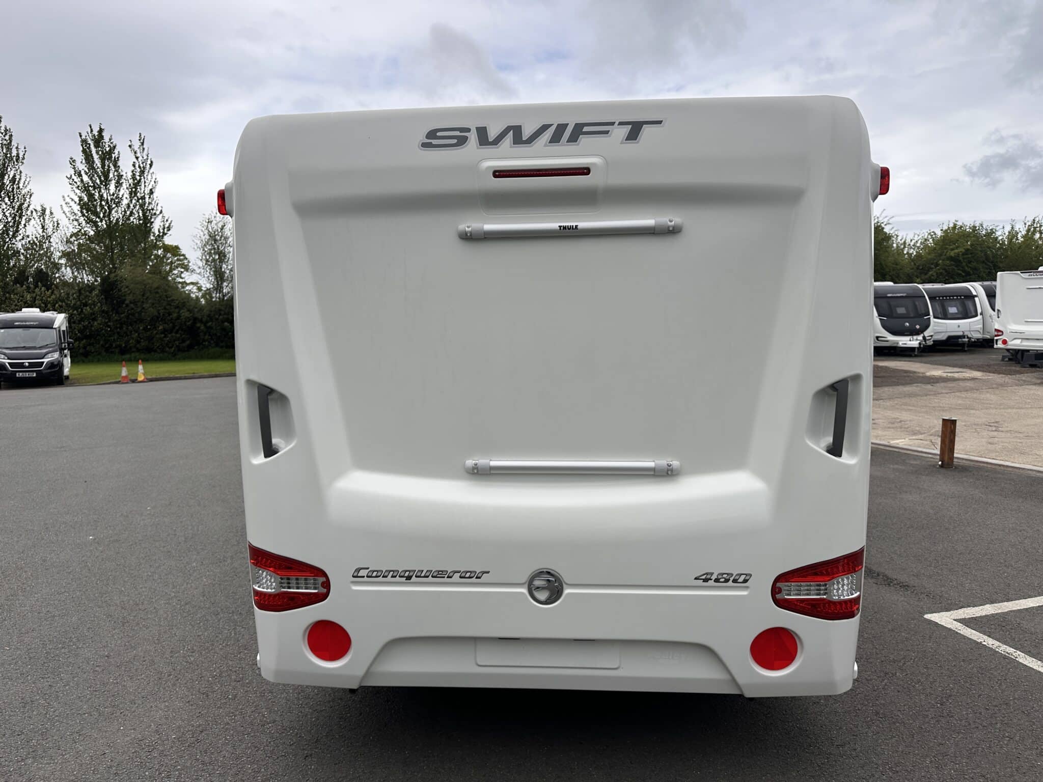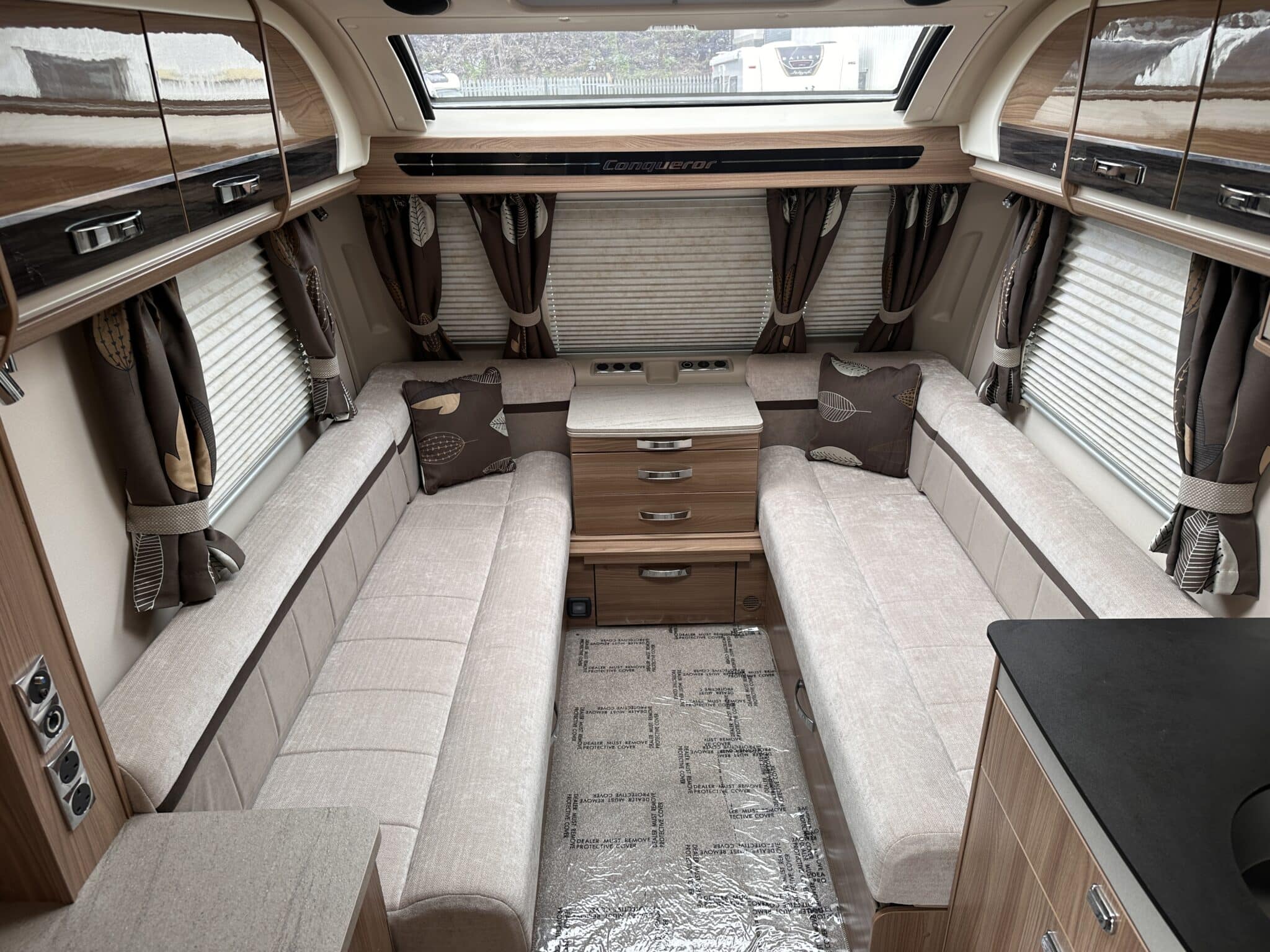 1. What is the layout of the Conqueror 480? It features a highly spacious front lounge that converts into a double bed (or two singles), a central kitchen with a tall slimline fridge freezer, and a massive full-width rear dressing room featuring a separate bifold shower cubicle.