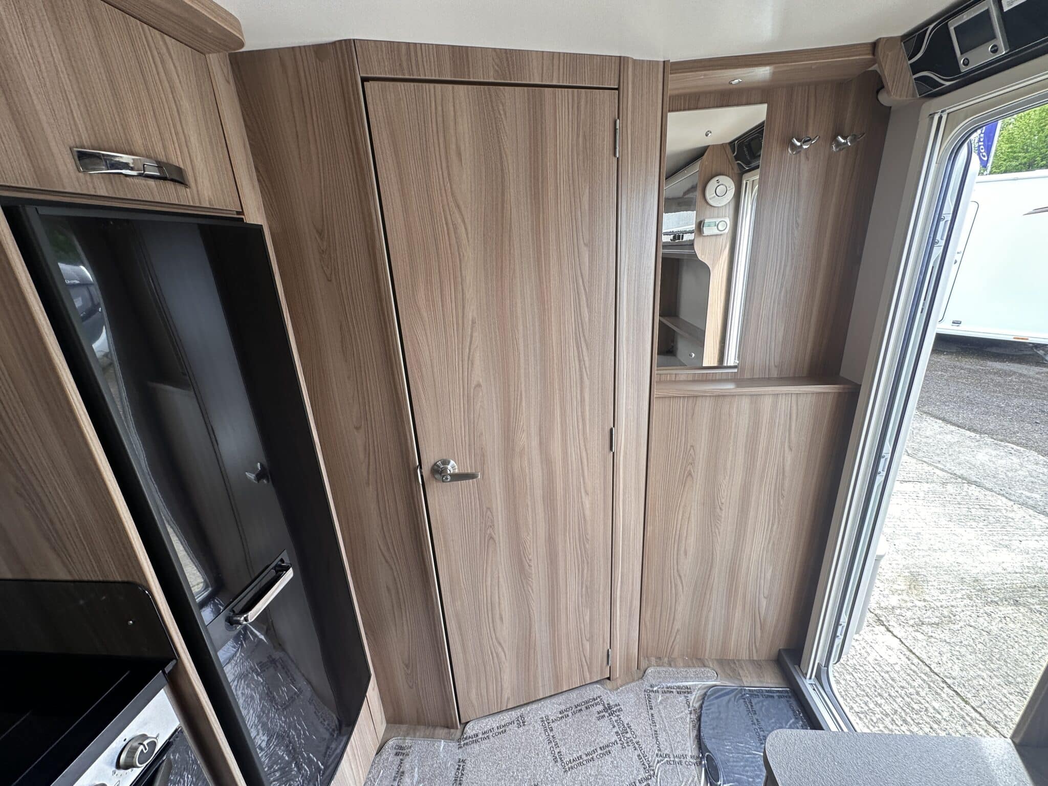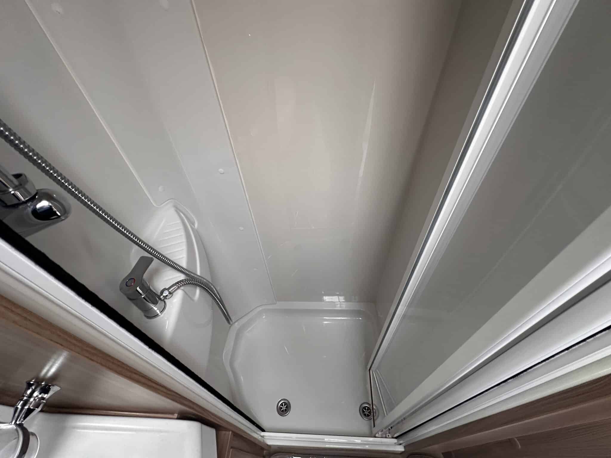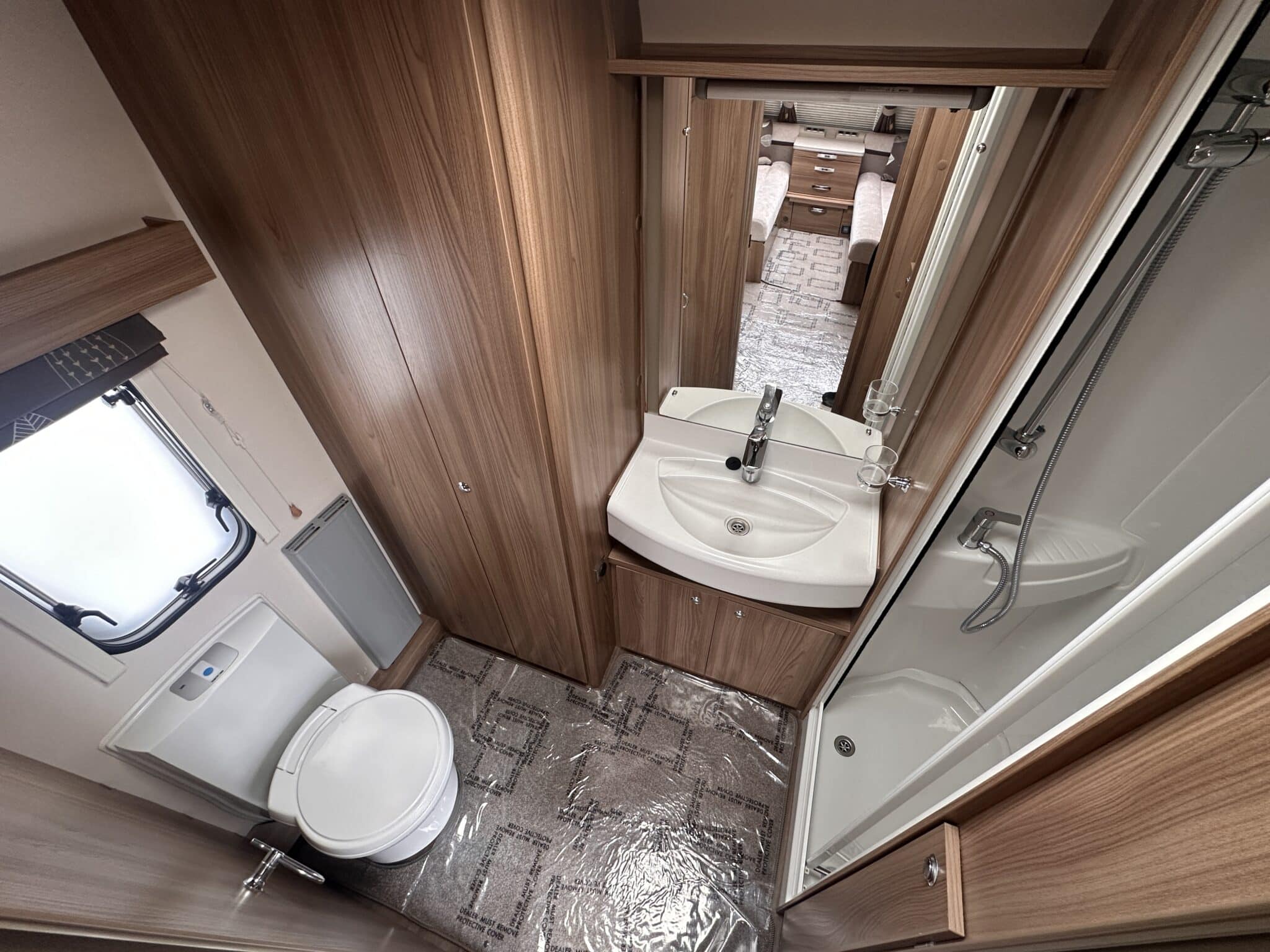 Washroom: A massive rear dressing room spanning the full width of the caravan. It features a separate bifold shower cubicle, a cassette toilet, a heated towel rail, and an illuminated vanity mirror.