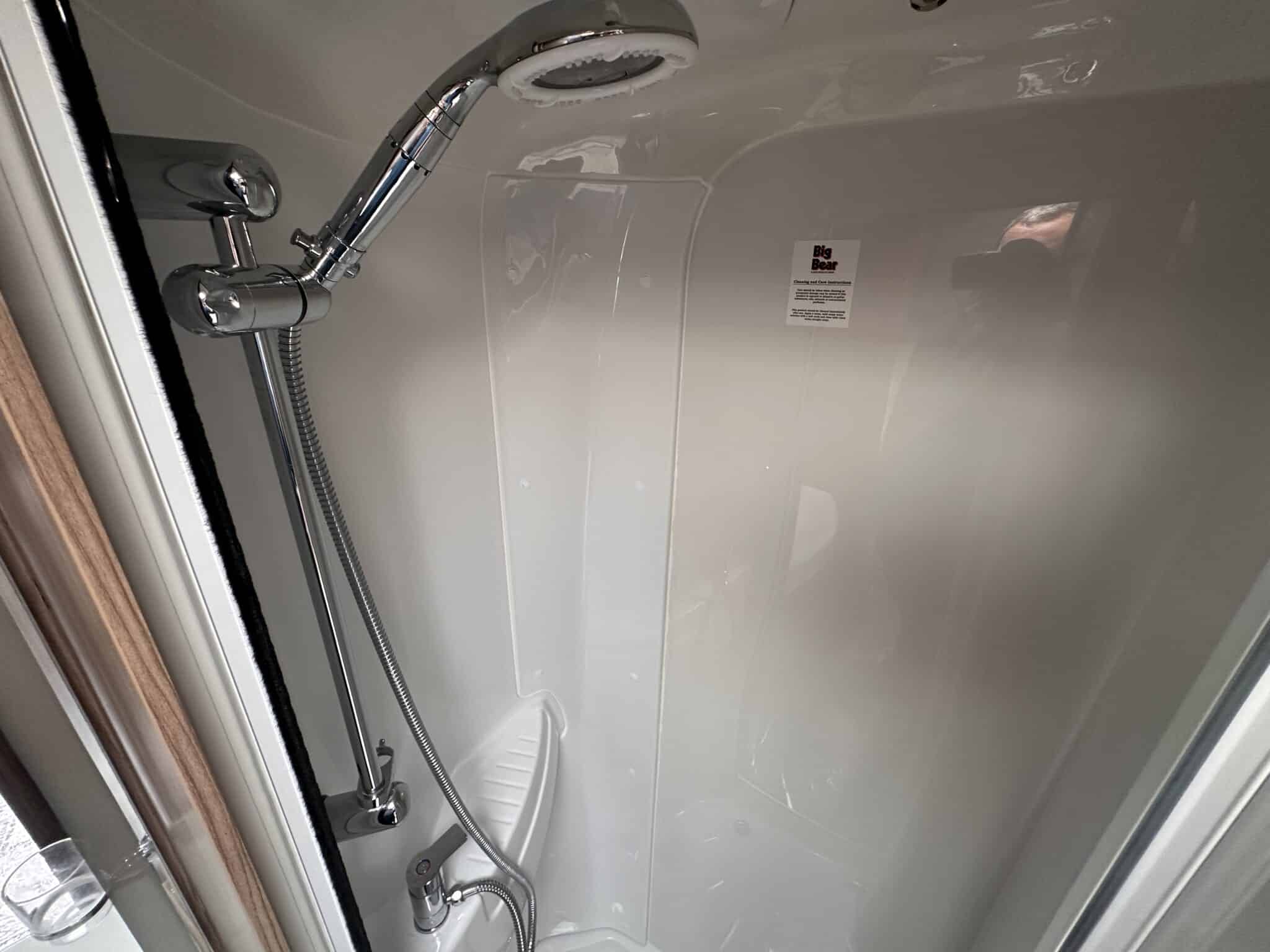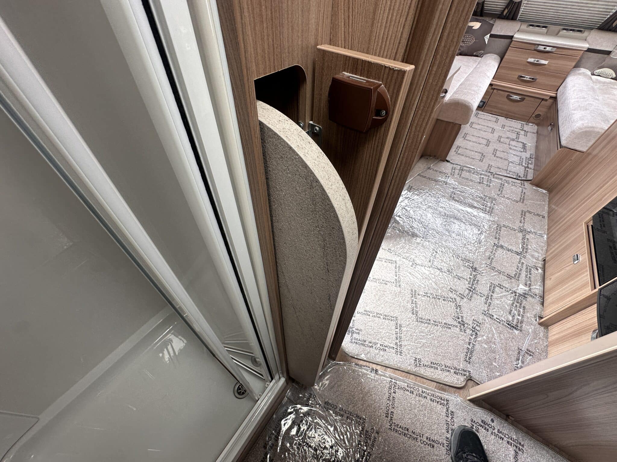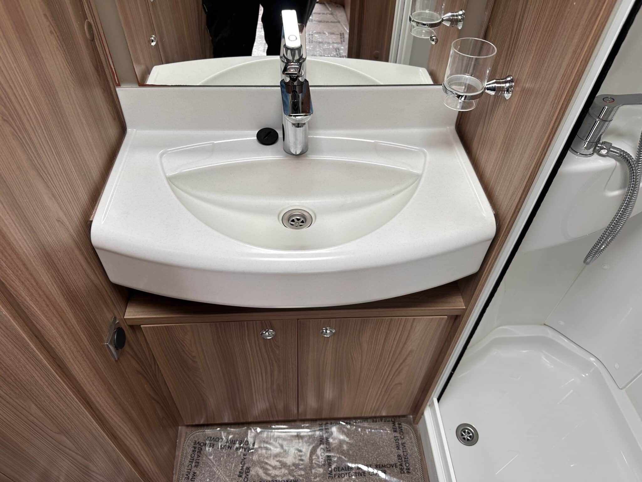 Washroom: A massive rear dressing room spanning the full width of the caravan. It features a separate bifold shower cubicle, a cassette toilet, a heated towel rail, and an illuminated vanity mirror.