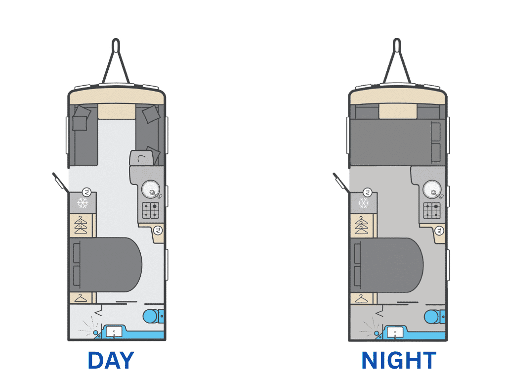 Layout: Transverse island bed with end washroom and front lounge conversion