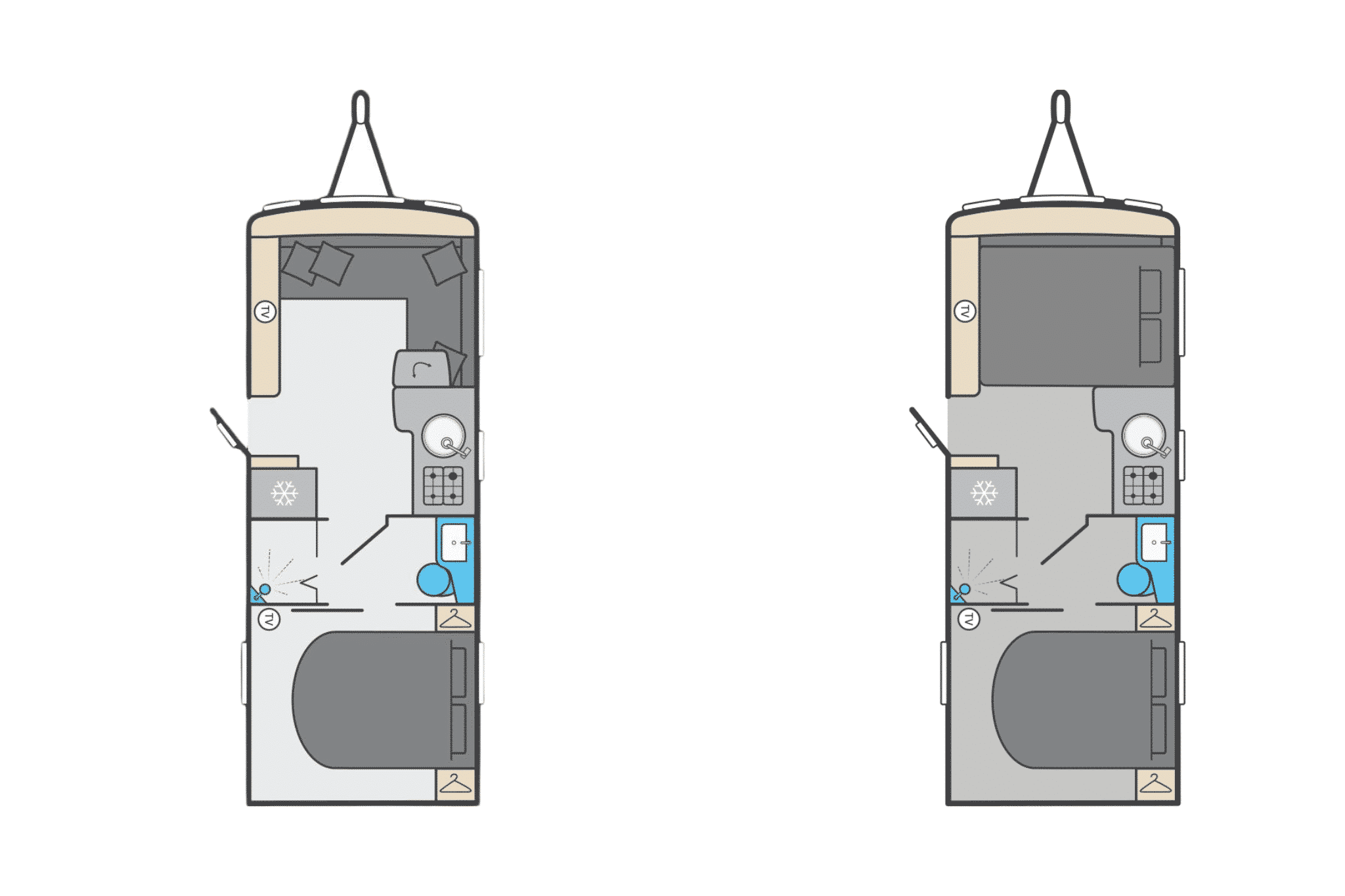 Layout: Transverse island bed with central washroom and L-shaped lounge