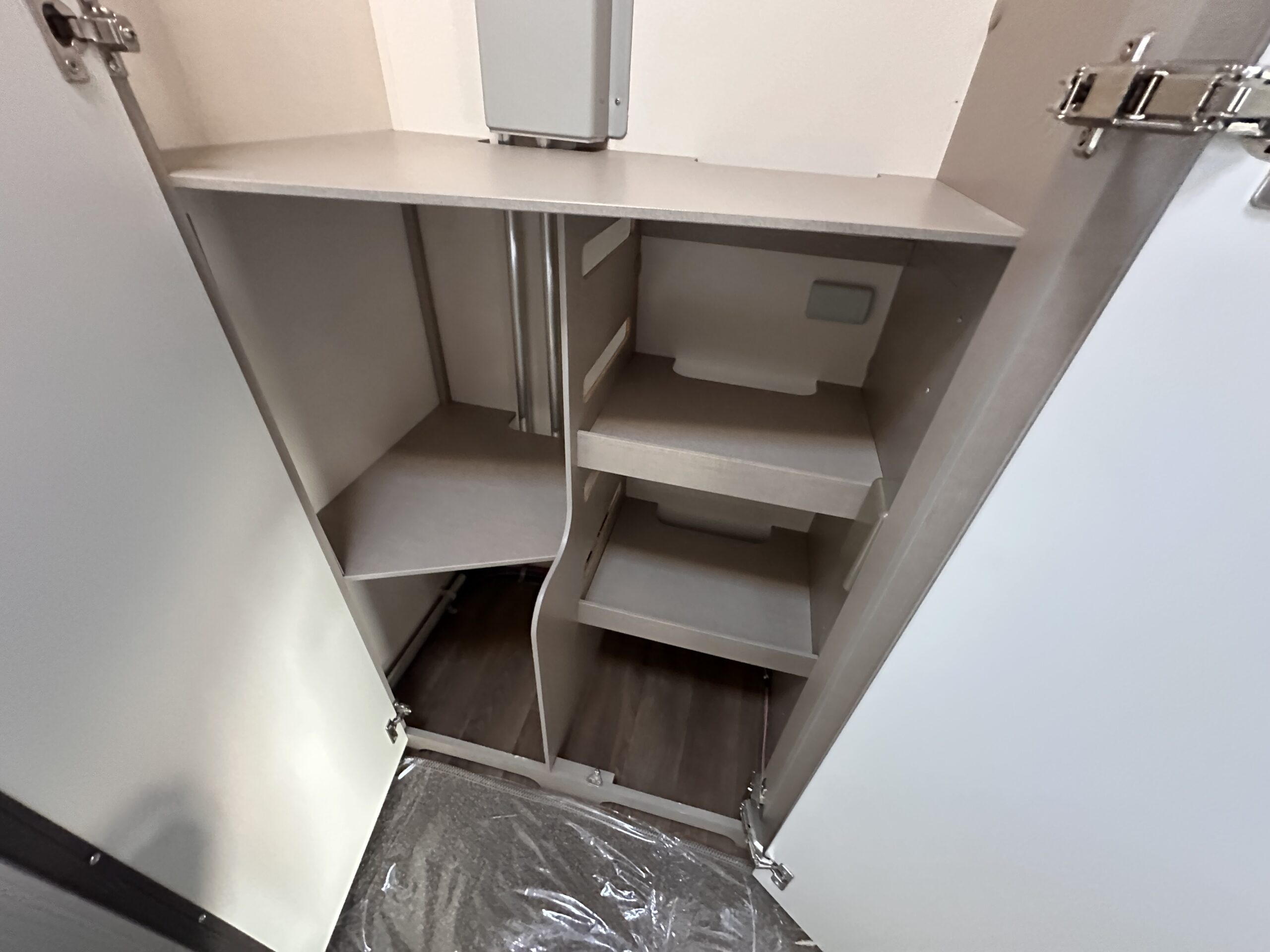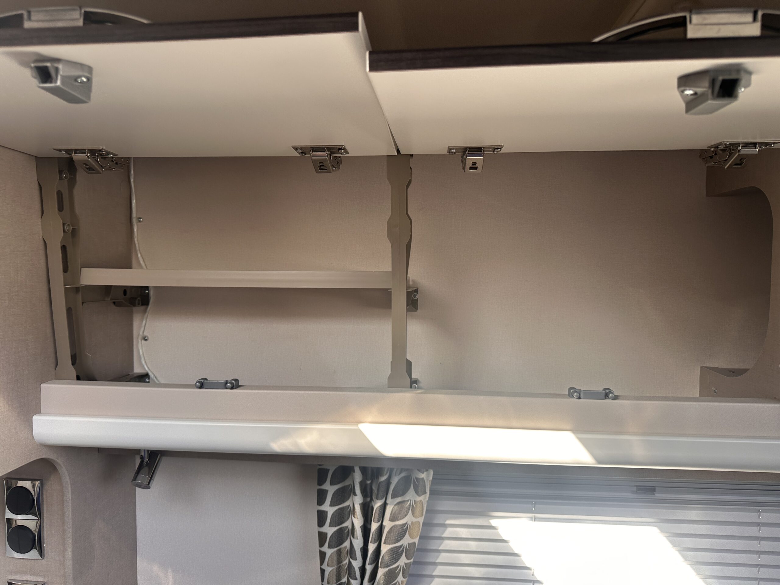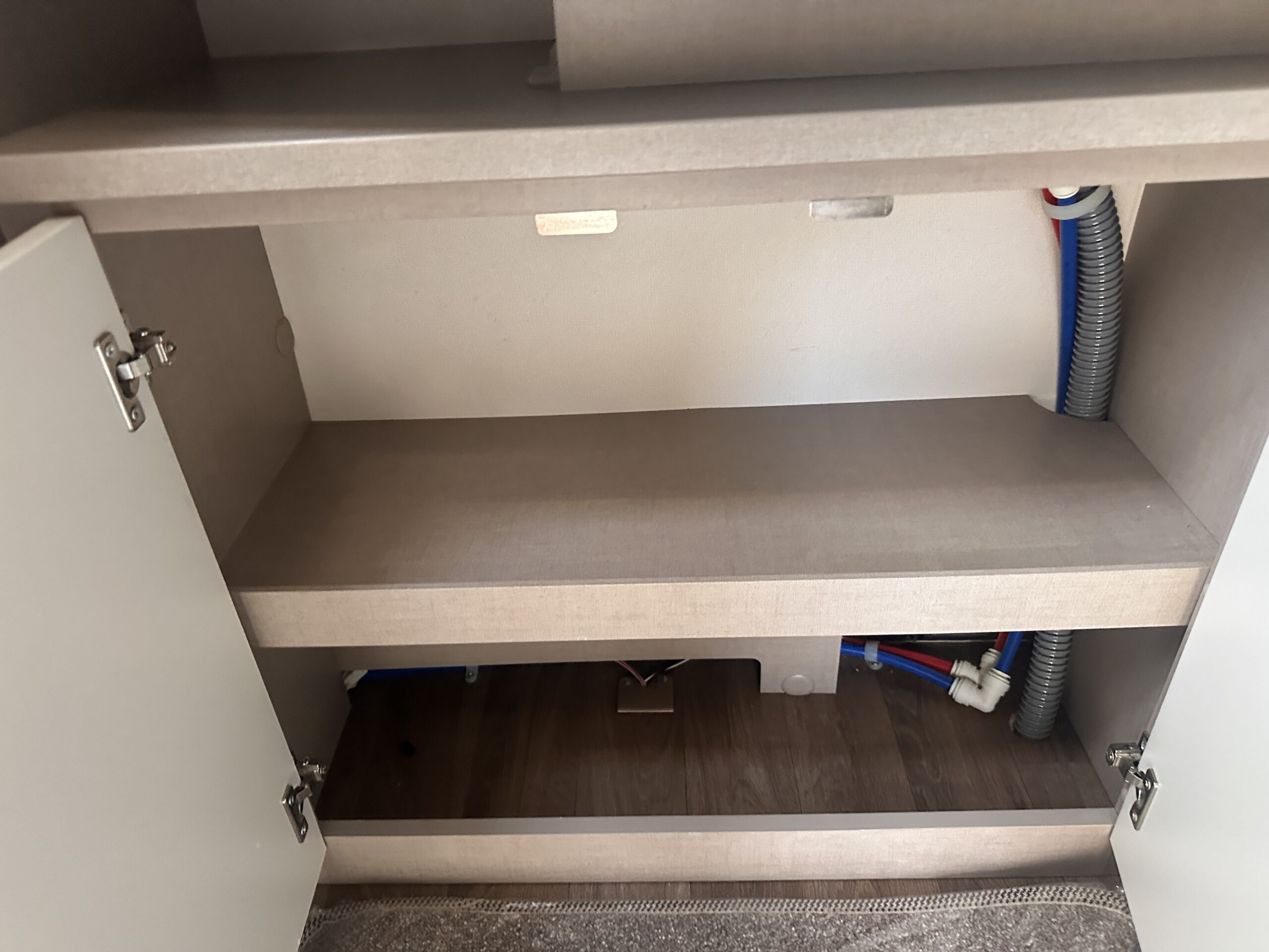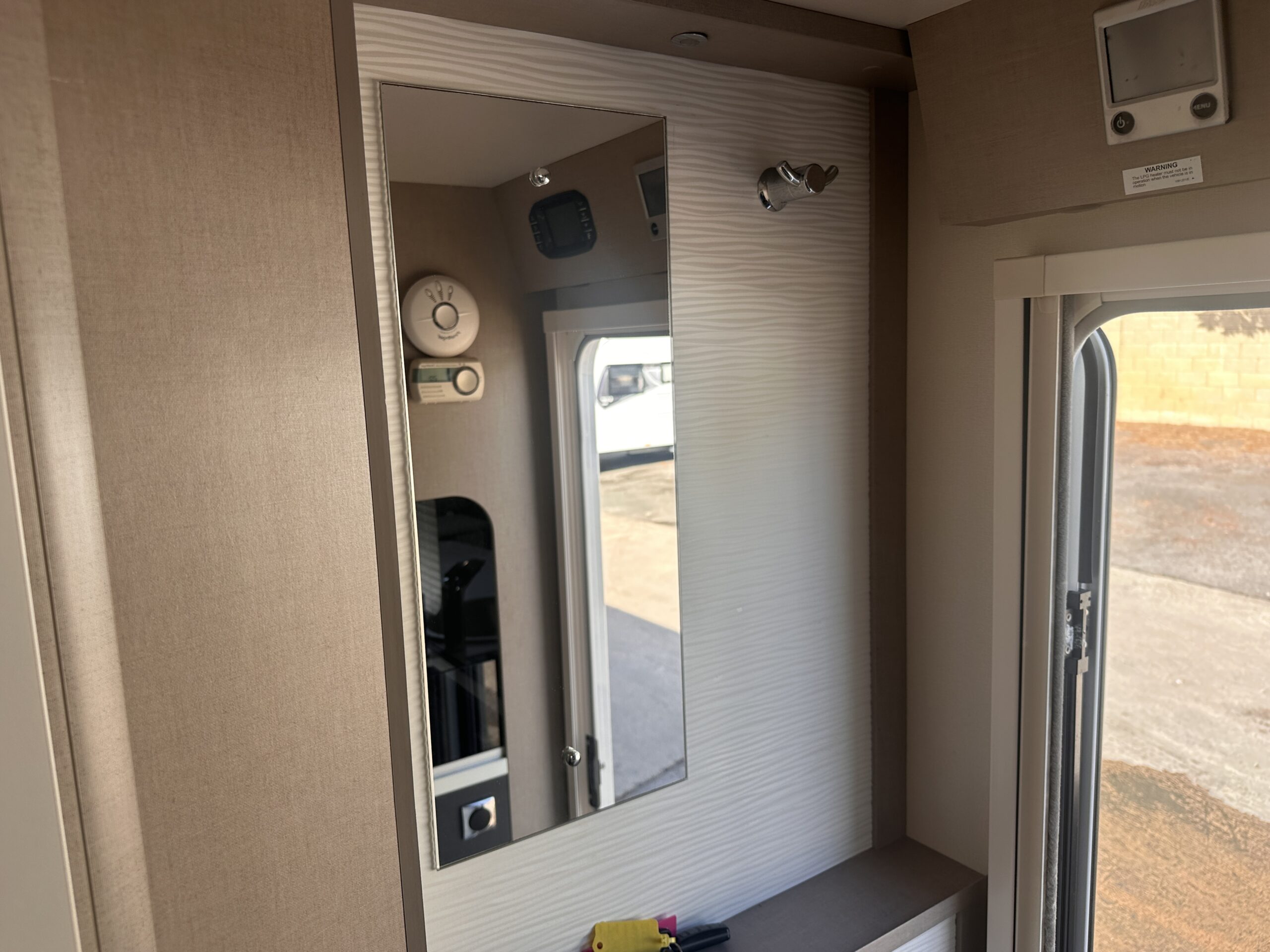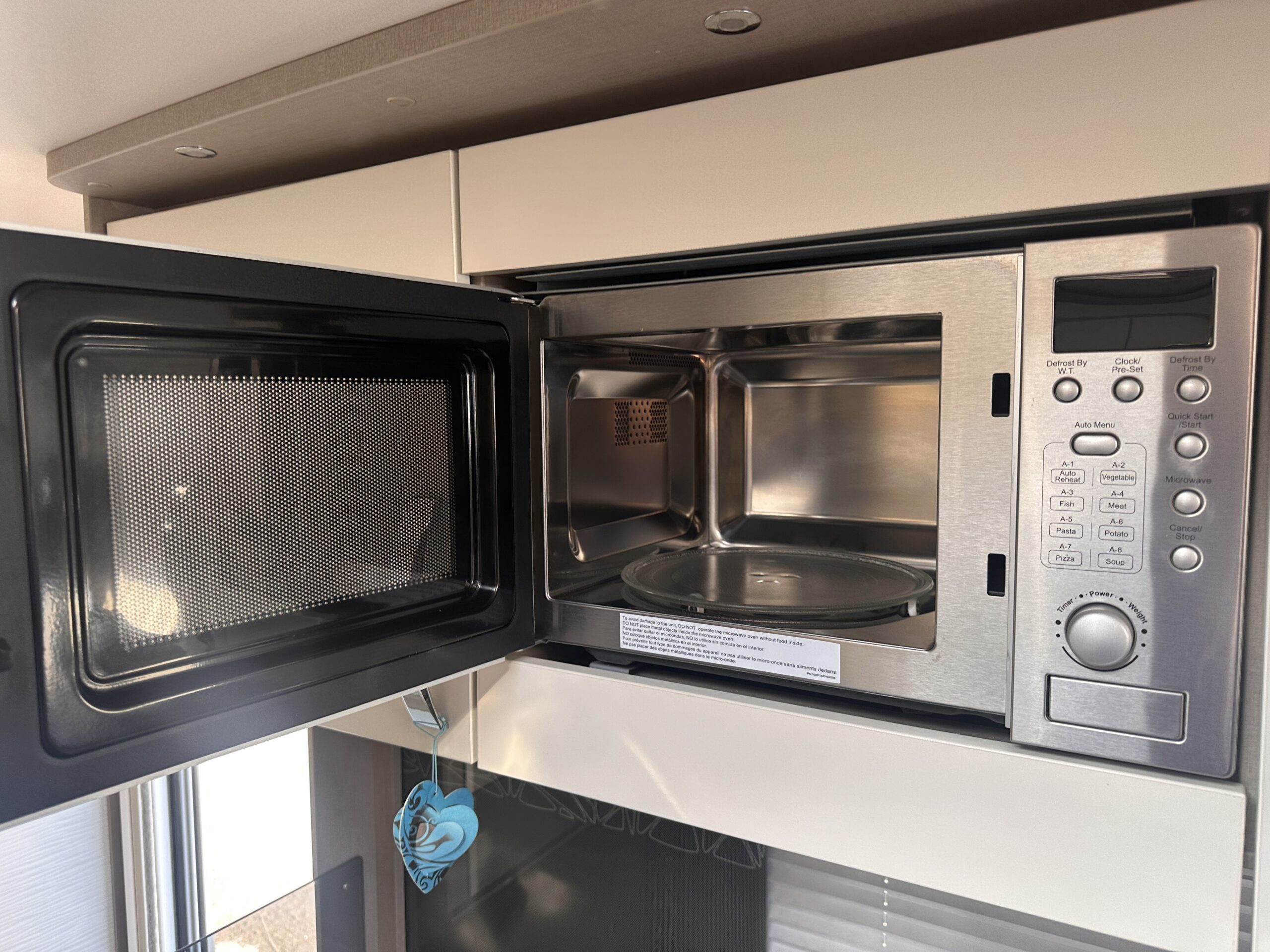 - Kitchen: A well-appointed kitchen features a dual-fuel hob, a separate Thetford oven and grill, a built-in microwave, and a slimline Dometic fridge/freezer, with plenty of storage and worktop space.