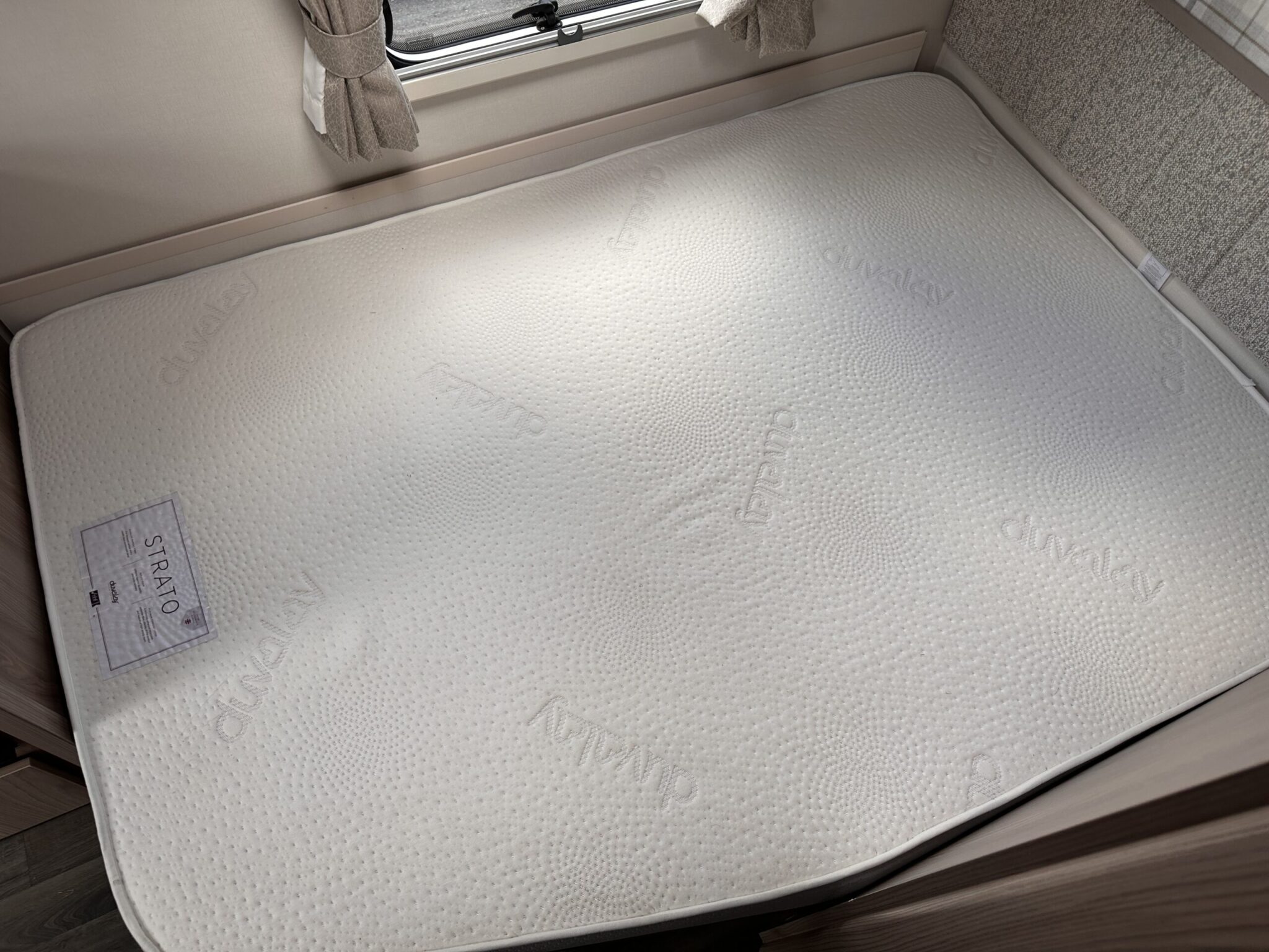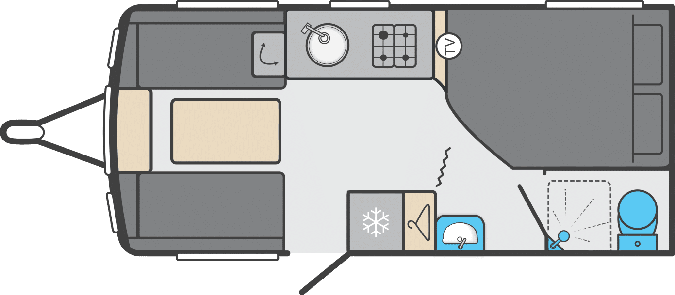 3. How does the fixed French bed layout work? The French bed in the Fairway 470 is a fixed double bed tucked into the rear corner. This is a very popular layout because it gives you a ready-made bed for the whole holiday, while the corner cut-off provides a clear walkway to the adjacent washroom.
