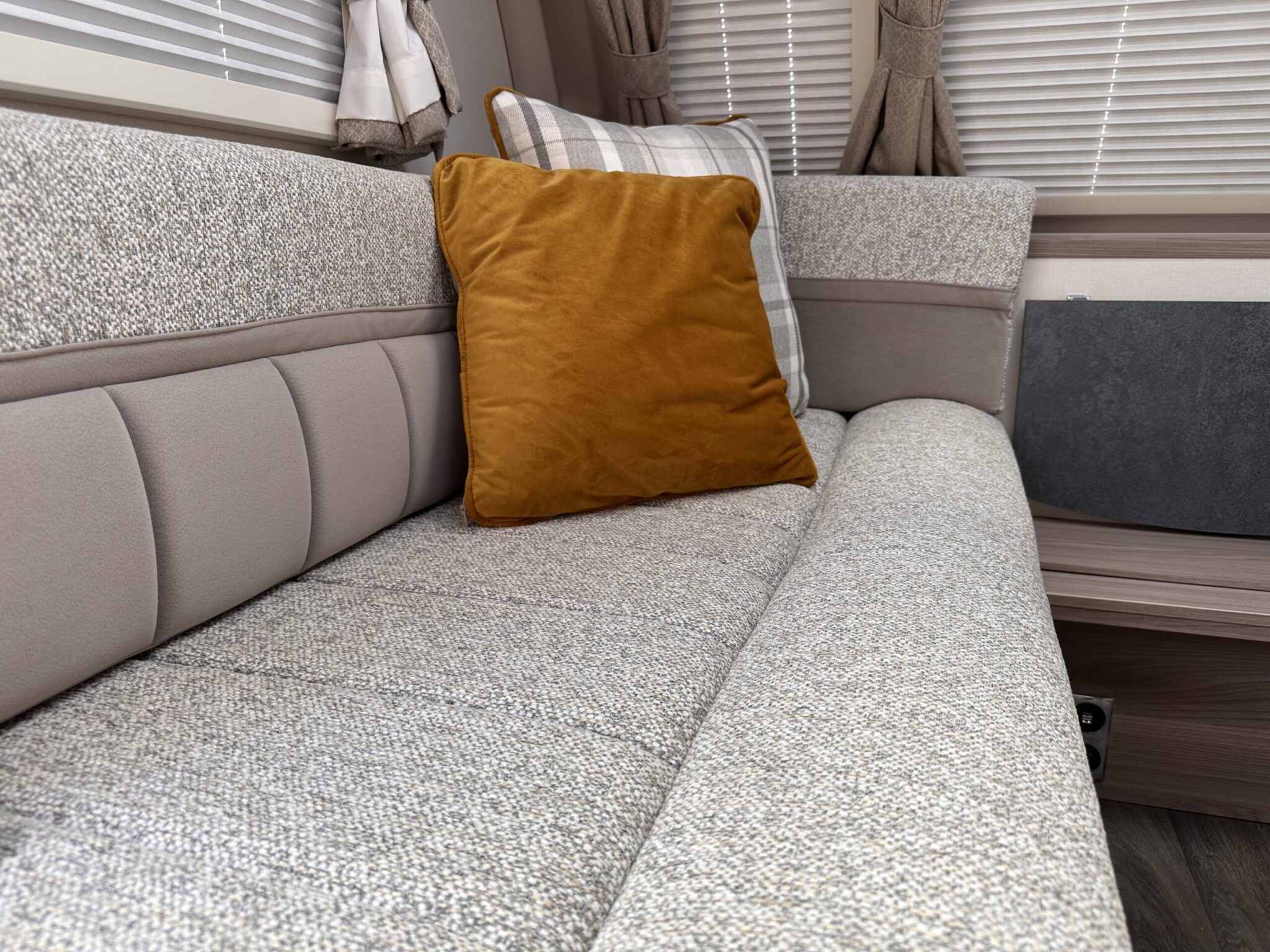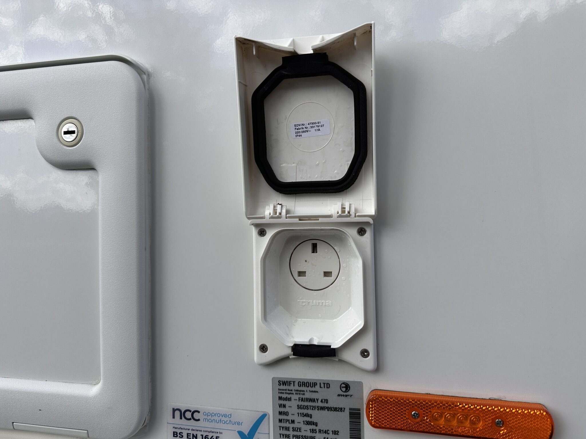 What does ‘dealer special’ mean for the Fairway 470? The Swift Fairway 470 is a special edition made for a specific dealer, so it comes with a much higher specification than the standard caravan it’s based on. This model includes upgrades like unique upholstery, an alarm, ATC for safer towing, a solar panel, and external gas and electric points, all of which would be costly extras otherwise.