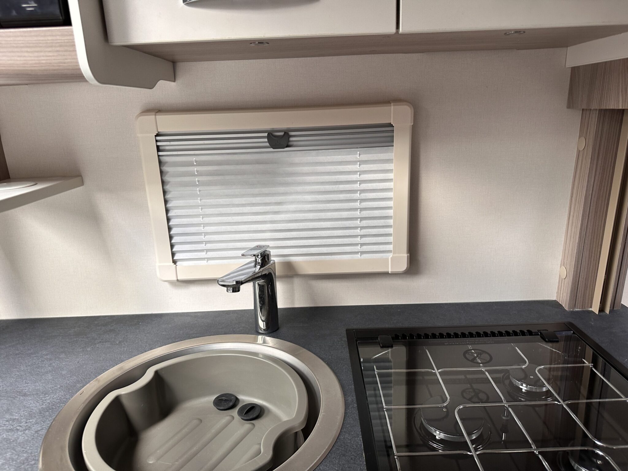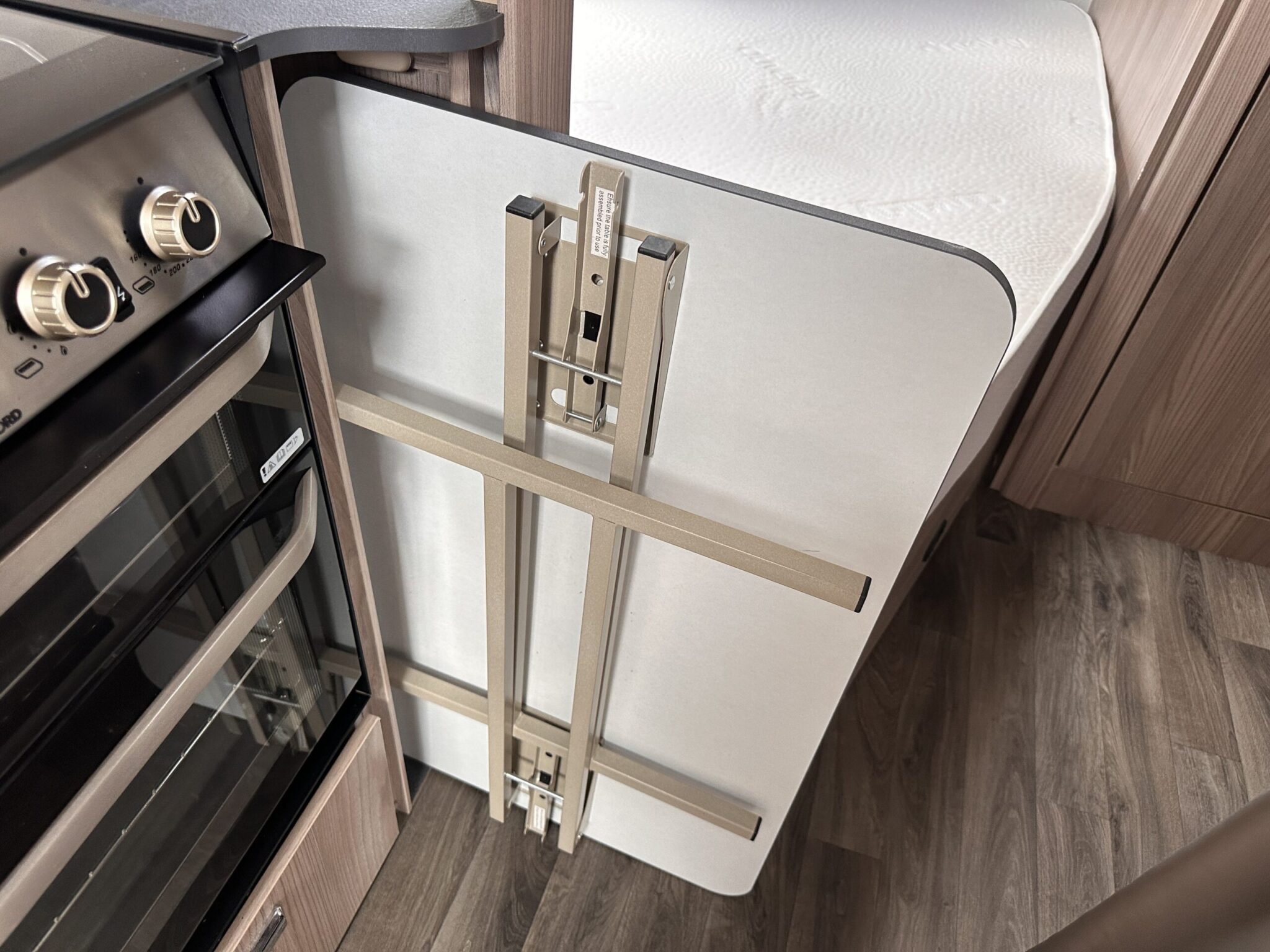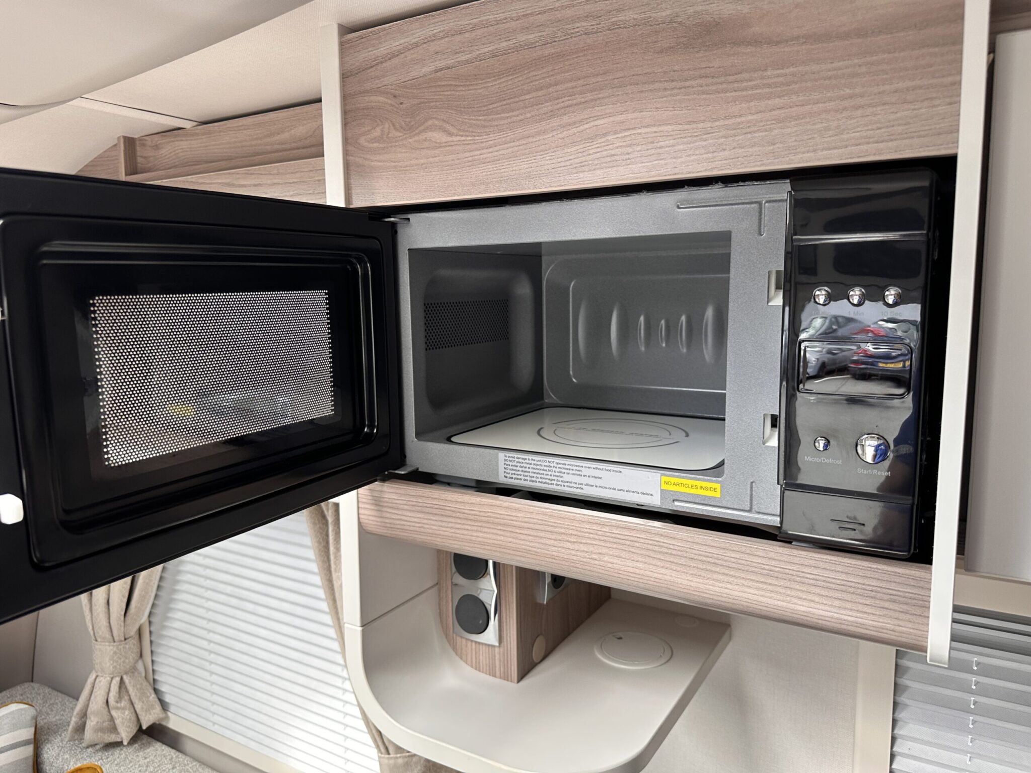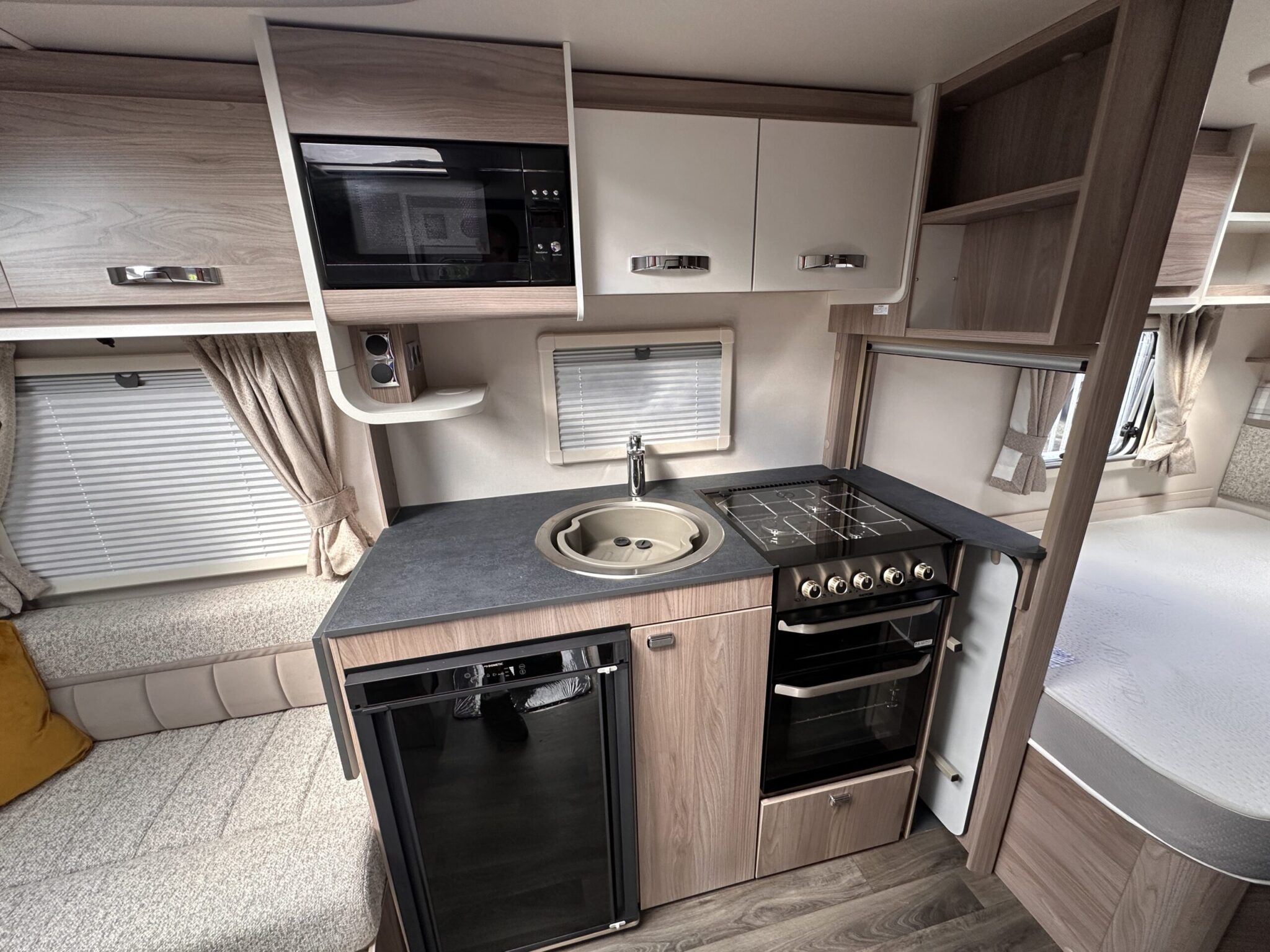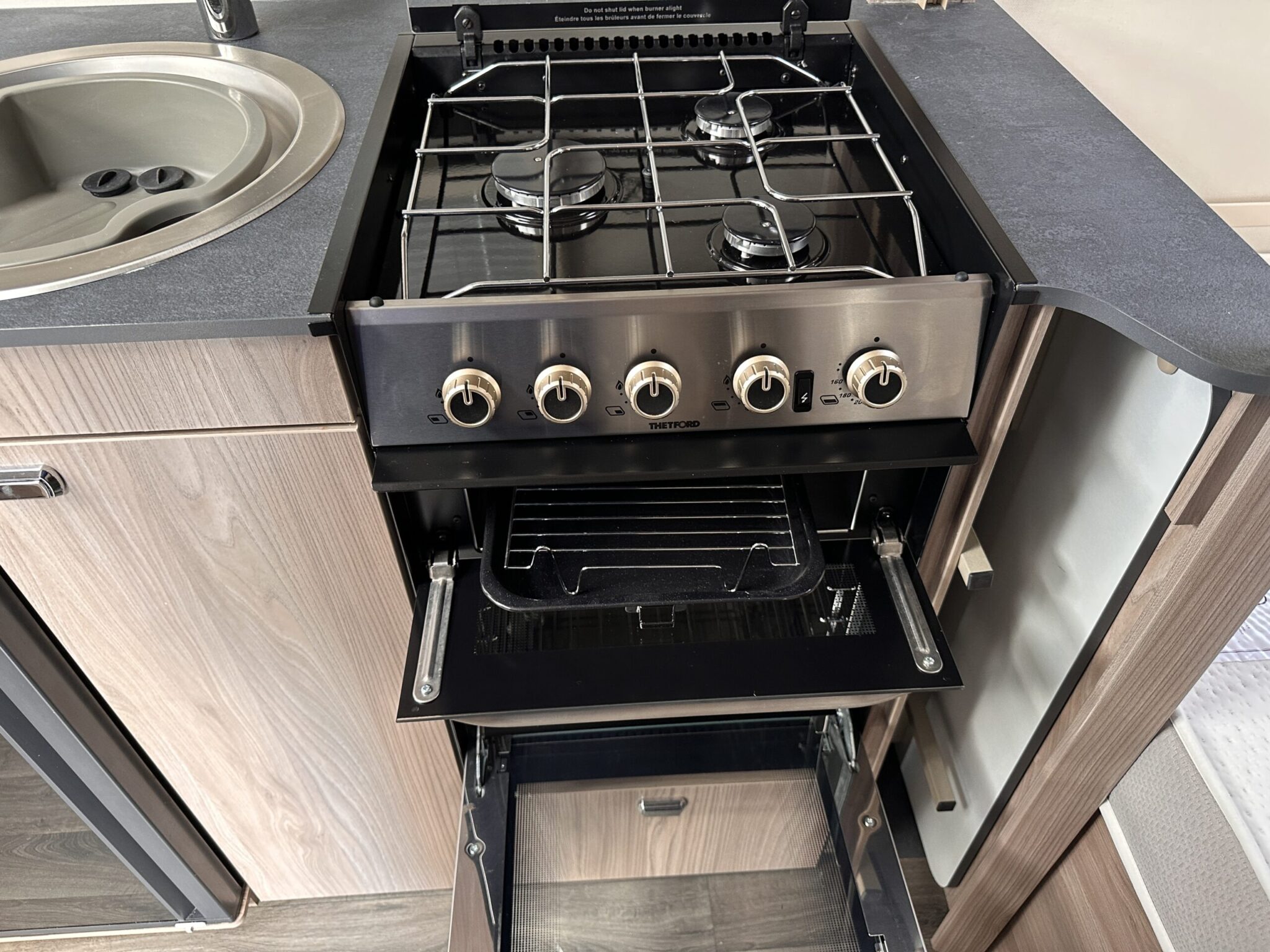 - Kitchen: The central kitchen is well-equipped with a Thetford oven and separate grill, a dual-fuel hob, a built-in microwave, and a Dometic series 10 fridge, providing all you need for your holiday cooking.