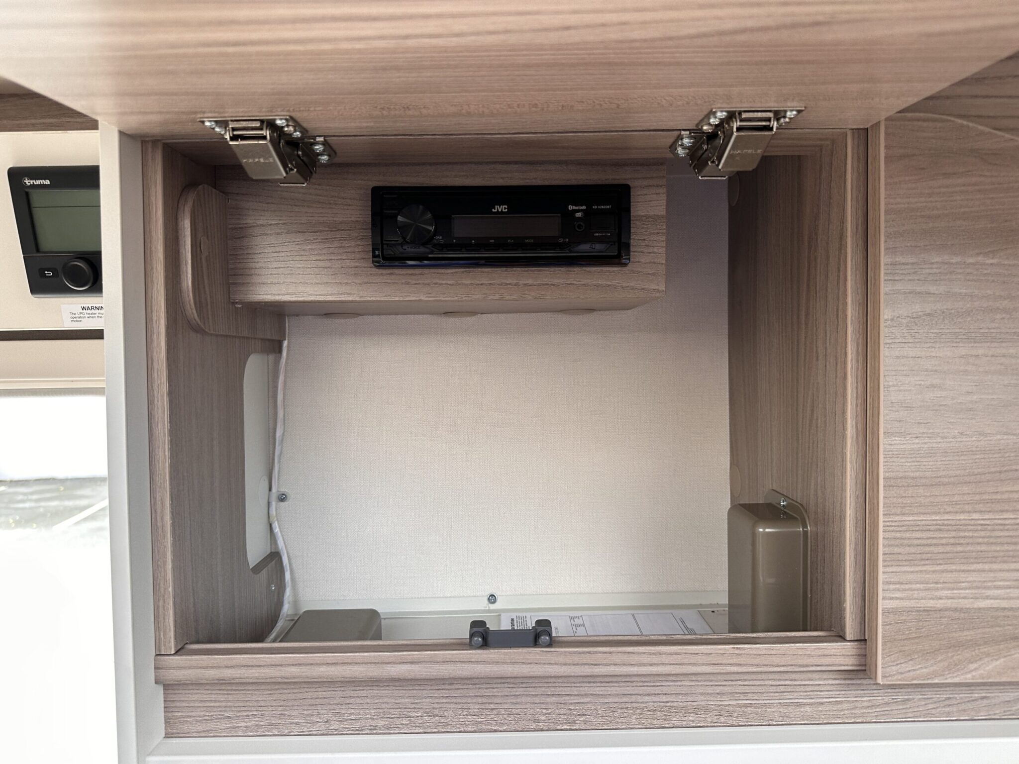 - Solar Panel: Comes with a factory-fitted 100W solar panel on the roof, which is ideal for keeping your leisure battery topped up when you’re not using an electric hook-up.