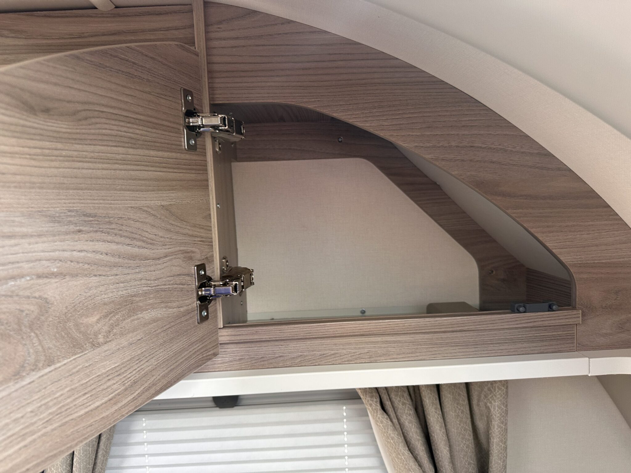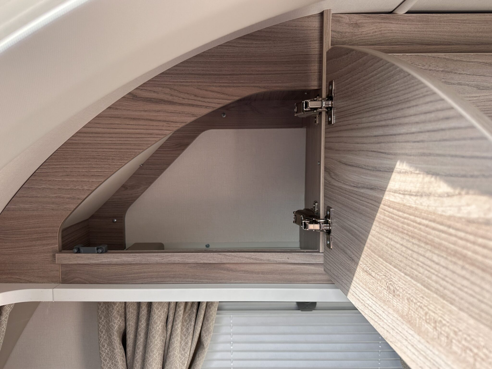- Bedroom: The rear bedroom area features a comfortable fixed French bed, so you can leave it made up for the entire trip. There is ample storage space in the overhead lockers and in the large area underneath the bed.