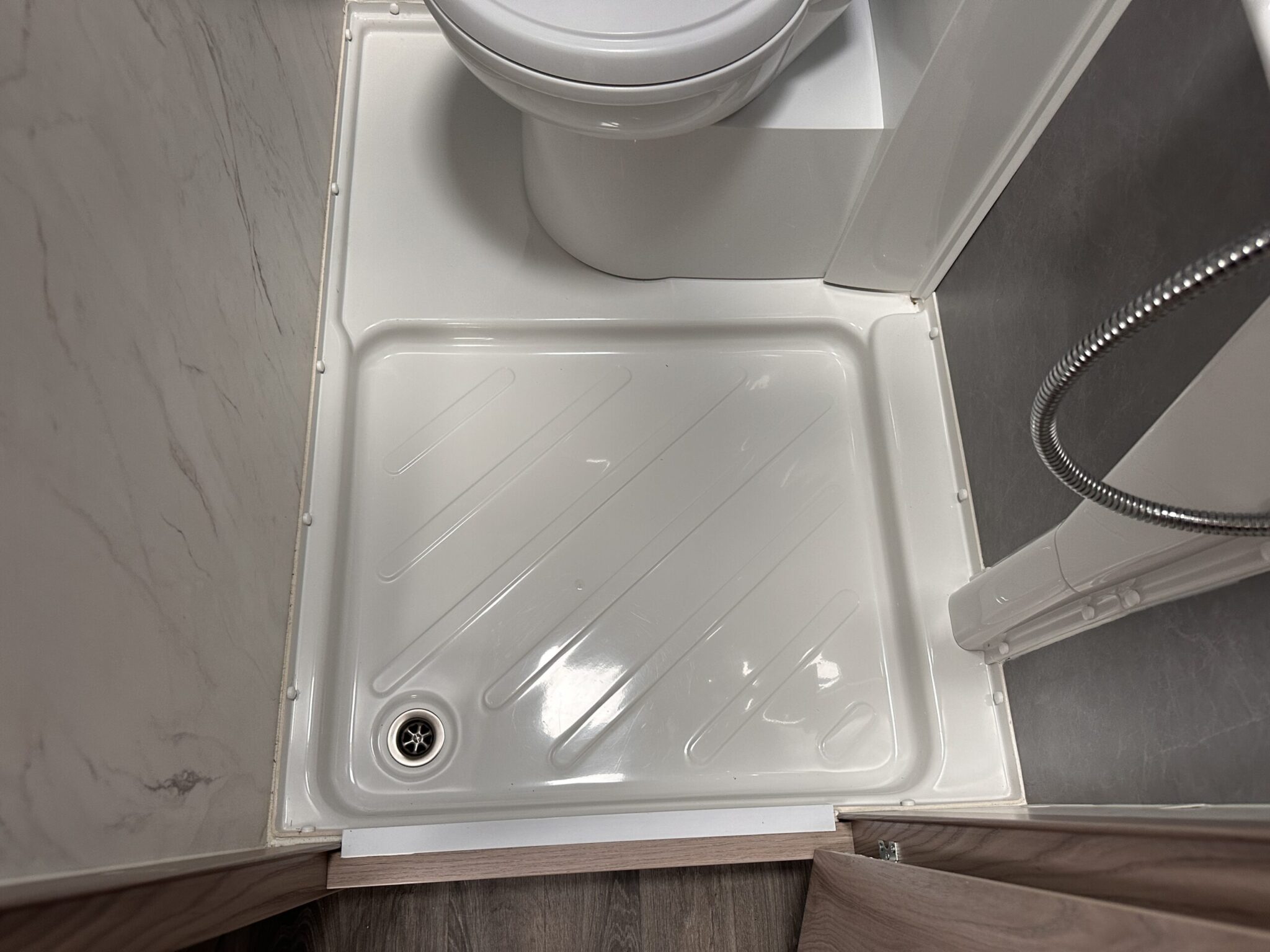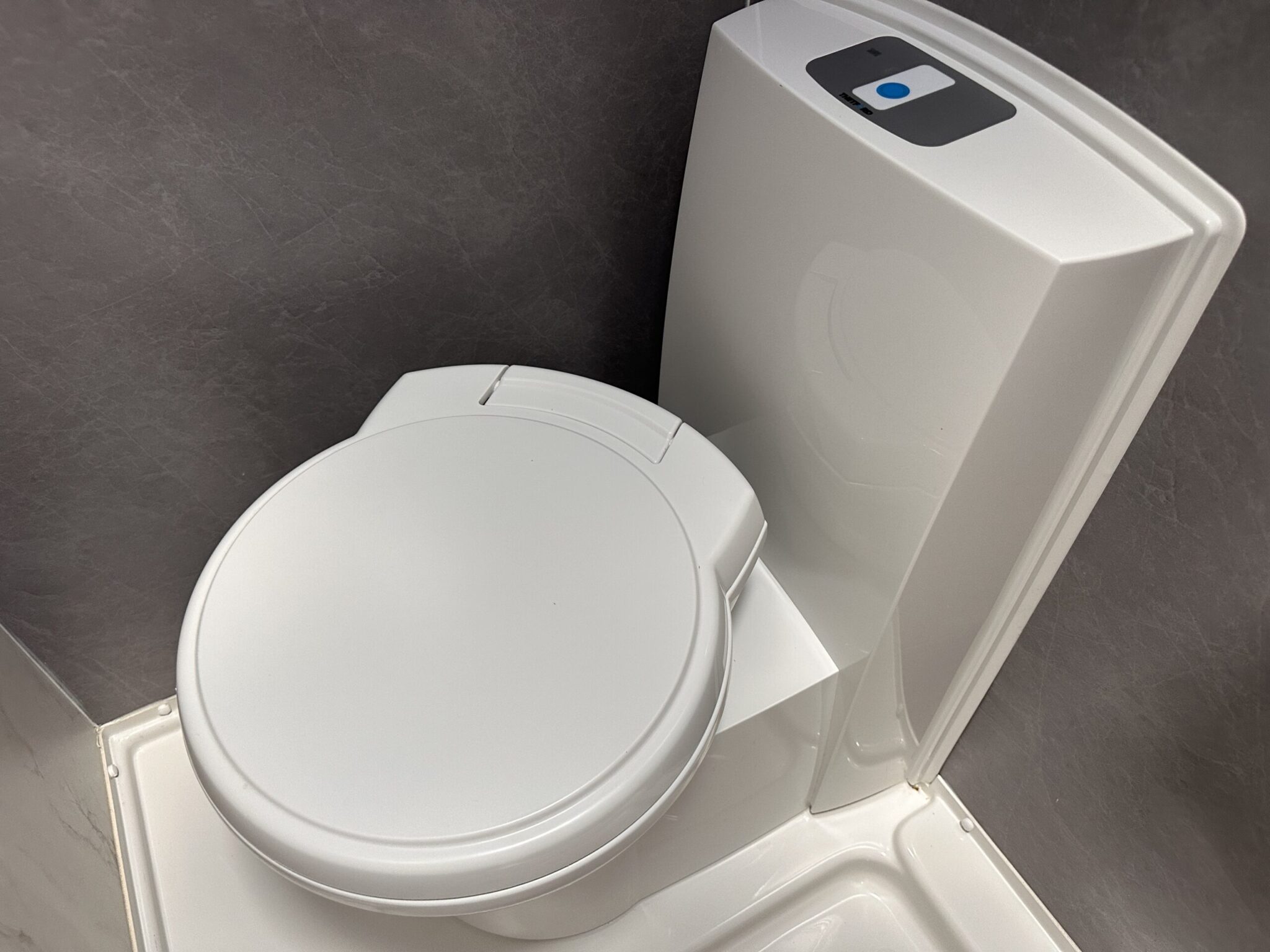- Washroom: A practical and clean corner washroom is located next to the bedroom, containing a cassette toilet, a vanity unit with a sink, and a shower.