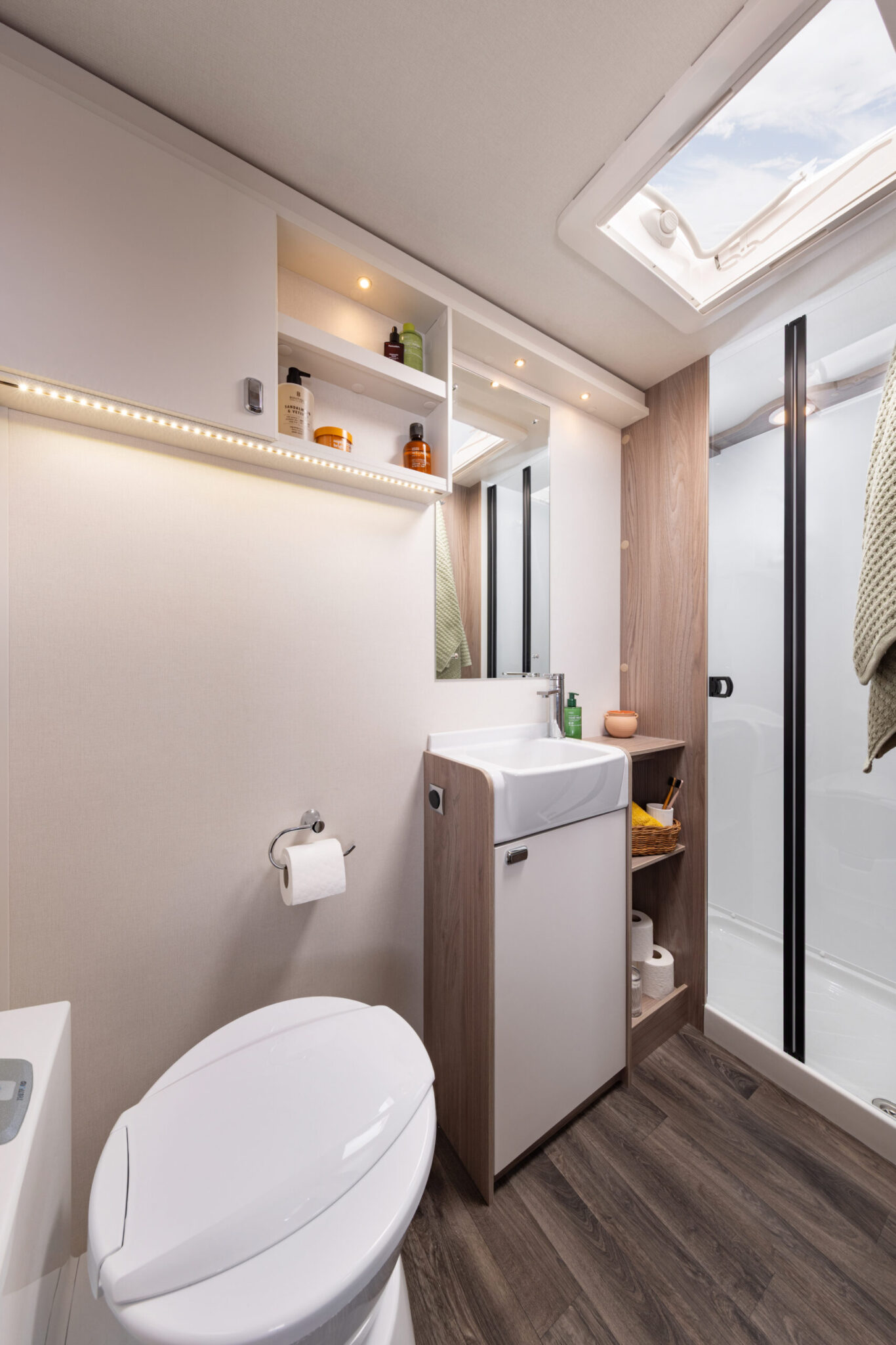 • Full end washroom with Ecocamel shower, washbasin, and cupboard