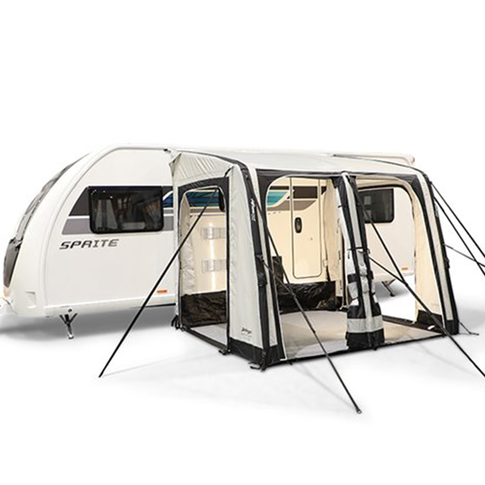 The awning features a split access door with a mesh panel for ventilation and easy access doors for wheelchair and pram entry. Zipped privacy curtains allow adjustable light control, and Diamond Clear windows maximize visibility. Bracer beams and a PVC mud strip add stability and easy cleaning. It’s fully wind and rain tested (EN5912), with steel rock pegs and adjustable pegging points for stability on uneven ground. The AirBeam® S.I Pro system enables quick single-point inflation, while self-isolated beams maintain structure in case of punctures. The SkyTrack® II system offers flexible hanging options for lights and storage, and reflective webbing straps improve stability in strong winds. The Draught Seal System, draught skirt, and wheel arch covers reduce drafts. Made from lightweight, waterproof 150D fabric, it’s designed for touring but not for long-term use due to UV sensitivity.